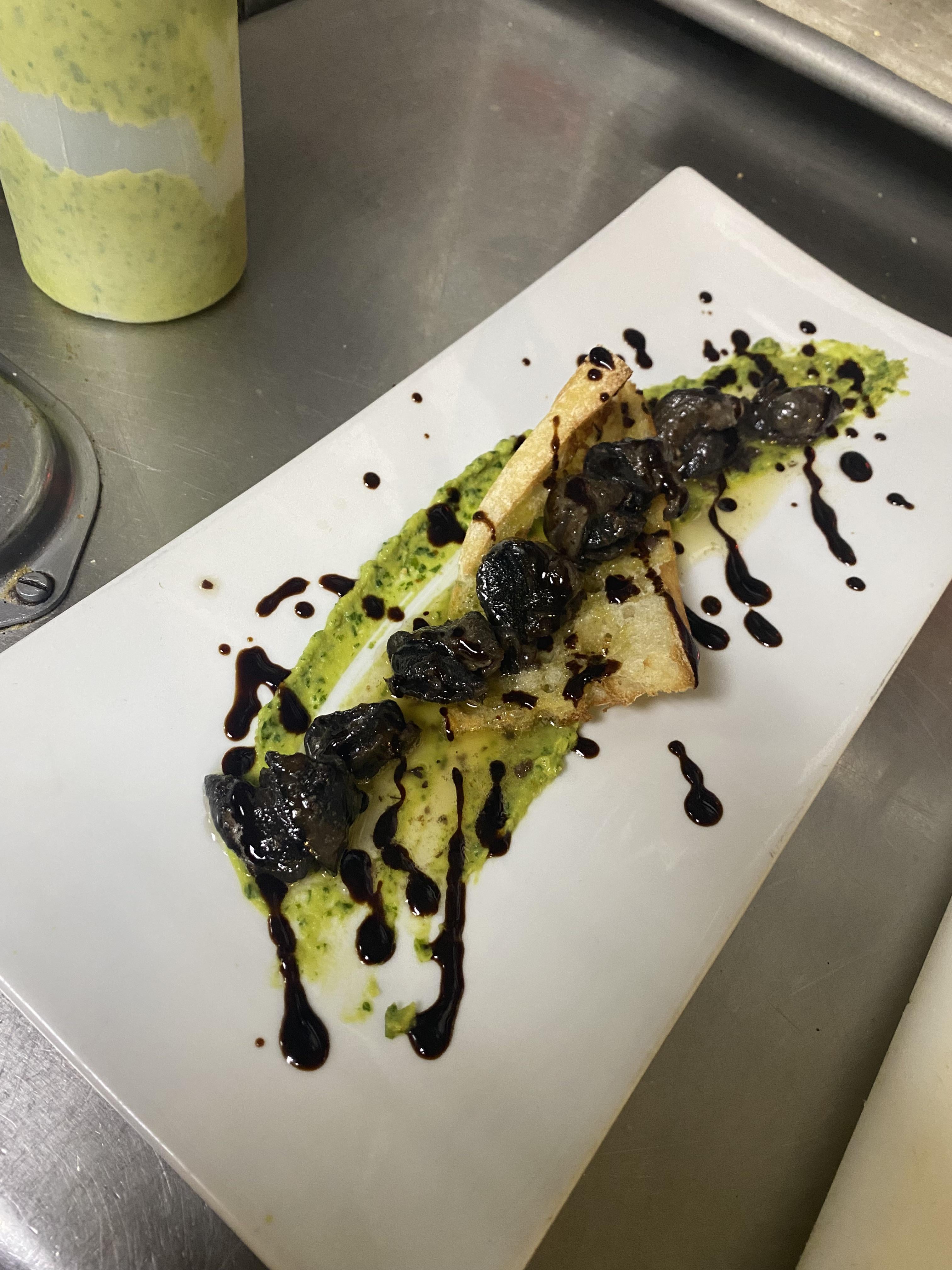 Doing an Escargot dish. Escargot sautés with white wine, chicken stock and a shallot, mushroom, red wine compound butter. Going over roasted garlic and kale hummus with a crostini. Finished with black garlic molasses glaze. Let me know what you think. Thanks.