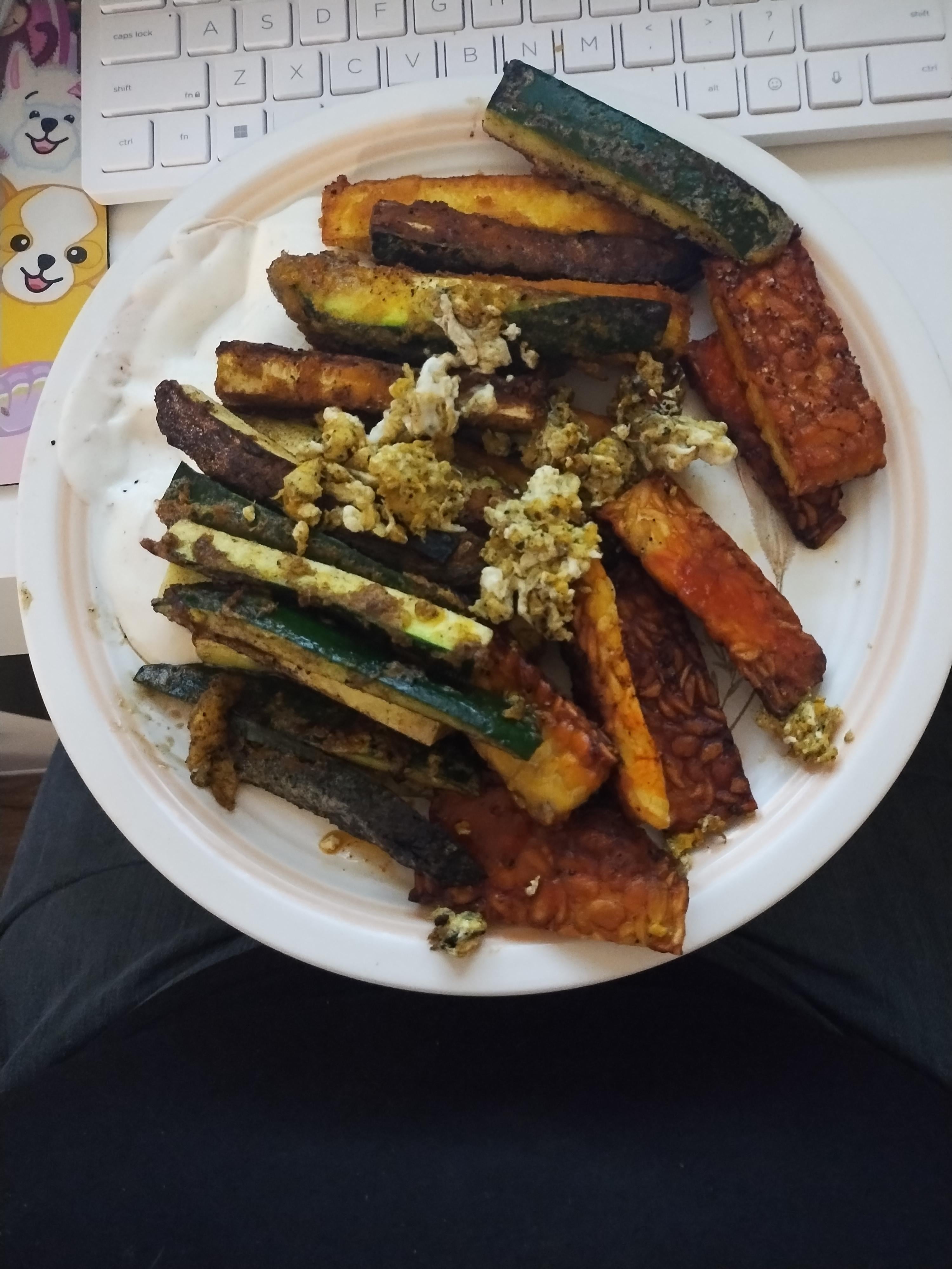 Fried buffalo tempeh, zucchini fries dredged in egg and nutritional yeast and fried, leftover egg always gets scrambled so there’s no waste. Macros include 2tbsp ranch.