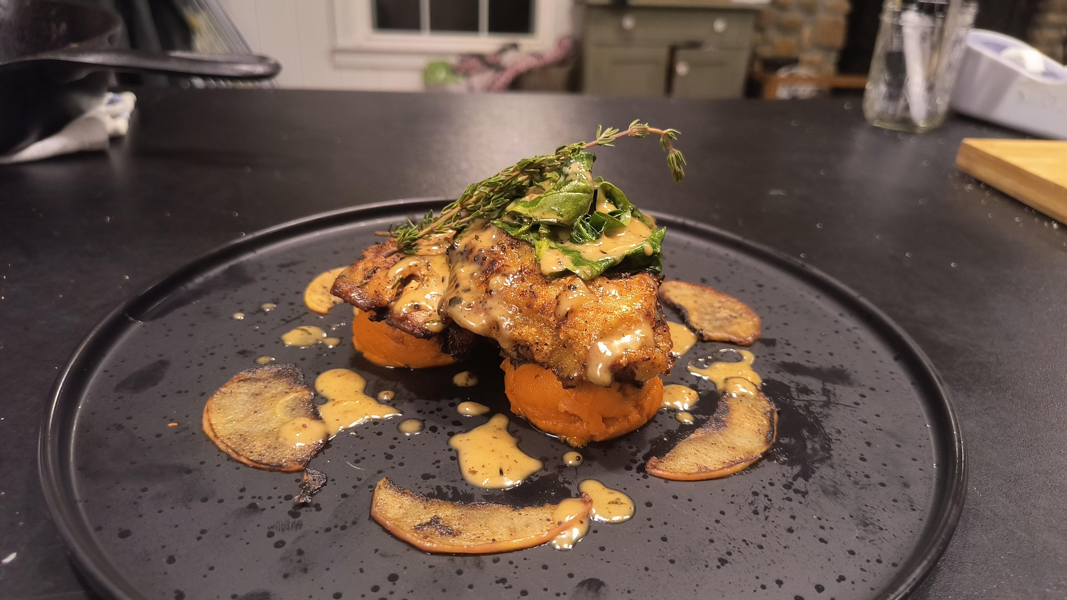 don’t stack the food up like a tower it looks gimmicky. Either have it spread nicely with the food on top or put it nicely next to it.