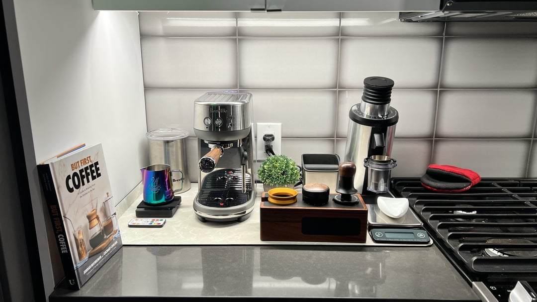 nice set up but i would probably switch the grinder with eg the knock box, just to not have it right next to the heat of the stove and potential fat sprinklings