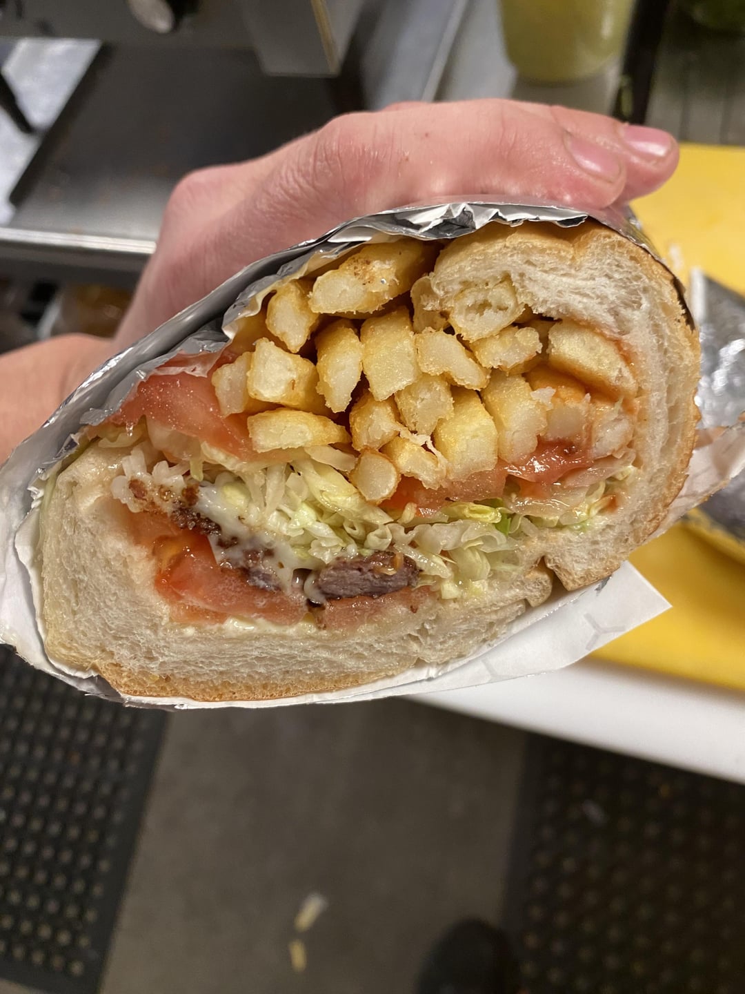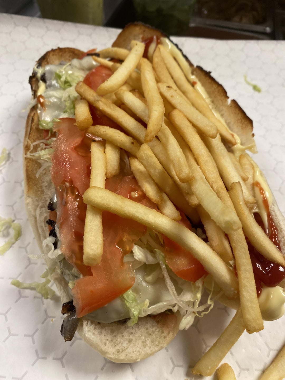 2 patties, fries, lettuce, tomato, ketchup, mayo. In retrospect, i could have used larger patties, i used two 2 ounce patties and should have gone 1/4 lb but, it was delicious and I only took a few bites and shared with the rest of the kitchen.