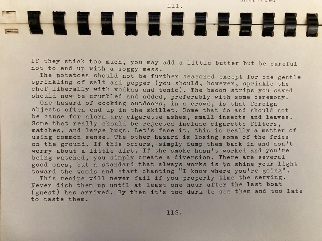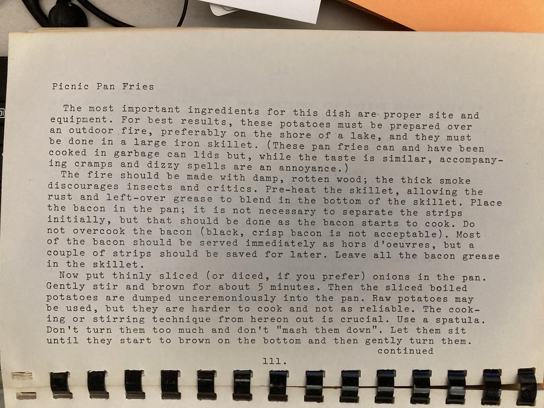 Great find here, I’m definitely going to post more recipes from this book. But I had to share this absolute masterpiece. The book looks pretty typical, with some good artwork and everyone getting credit for their recipes. But then you get to “picnic fries” and the wheels come off in the best way. Enjoy.