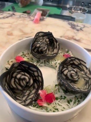 could be the photo/light but the black accent on the cappelletti is just a bit too tight for my preference when paired with your base on that plate. its like there’s too many surfaces or sections consistently throughout the dish and i think it’d be more appealing with some more subtle contrast, (the black v white is already dramatic enough imo).