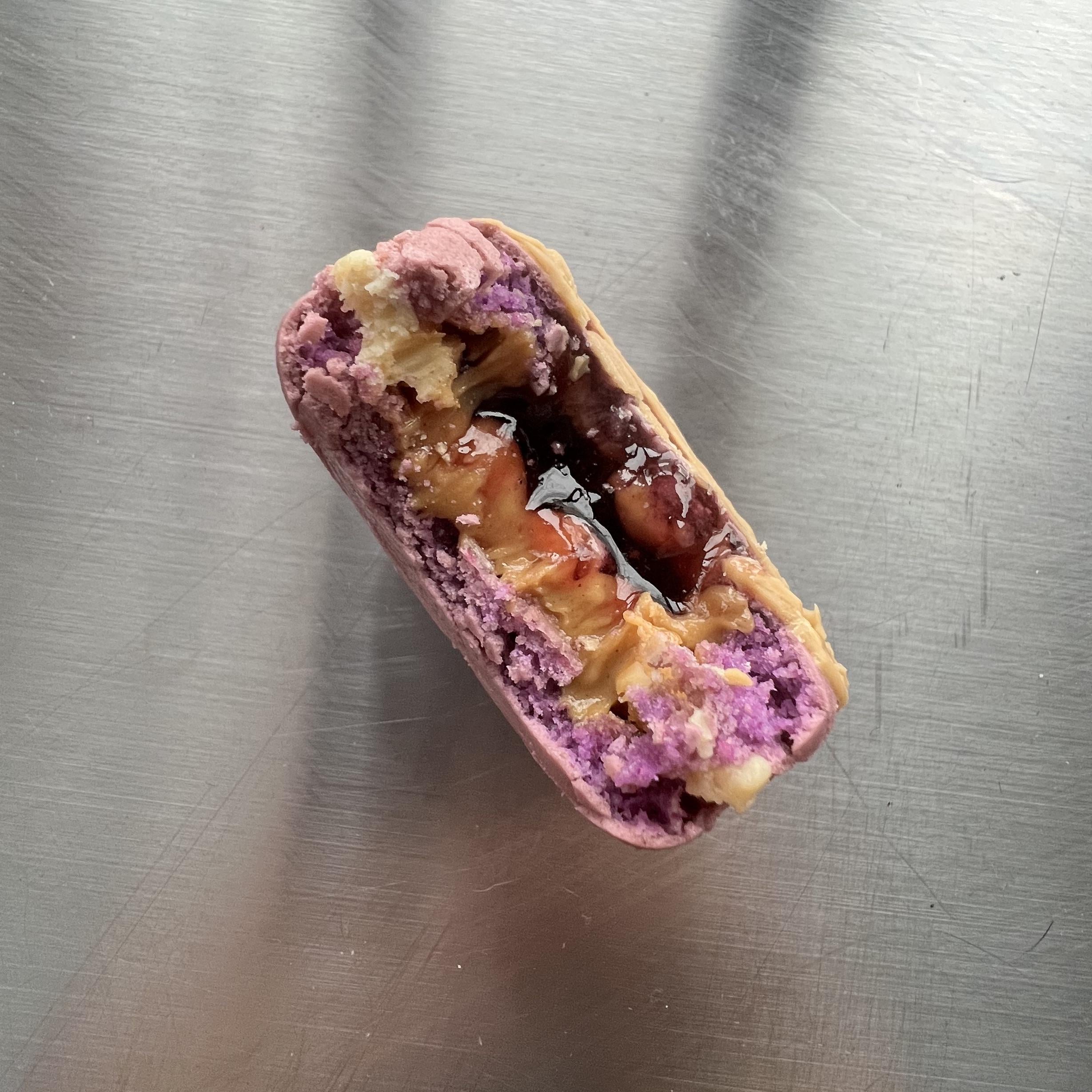 Ring of peanut butter ganache and filled with grape jelly and some peanut butter!