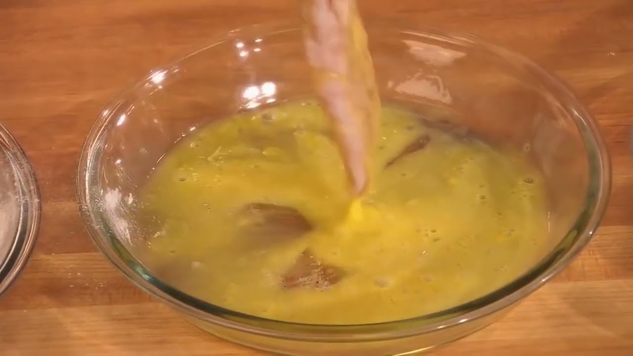 Now clean our little hands here and then we’re going to add a little bit more Essence on that side of the chicken I’ve got one egg and breadcrumbs this is a classic breading no matter what you want to bread from mushrooms to chicken to beef now watch we dredge