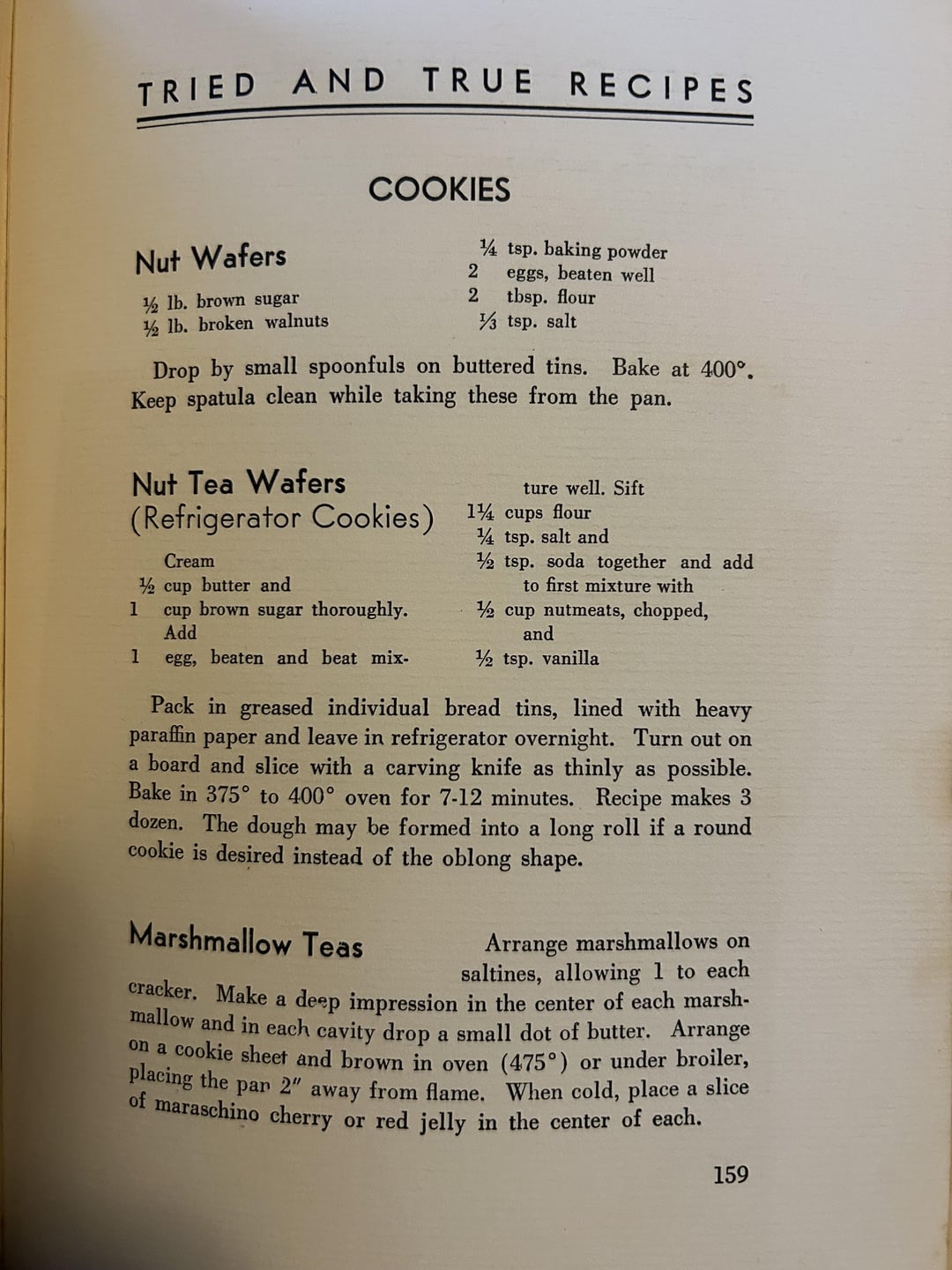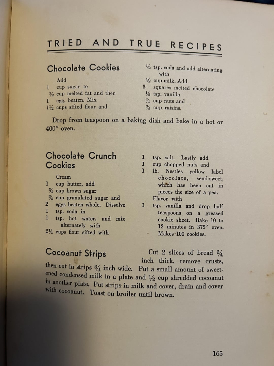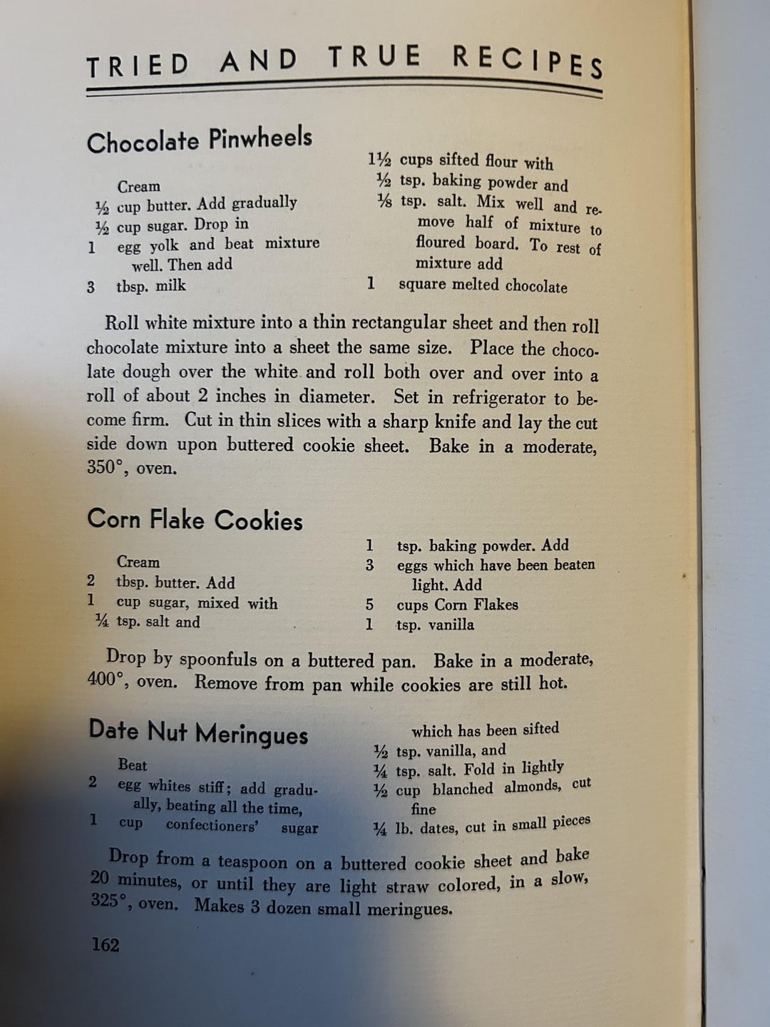 This is the cookie recipes from Ruth Wakefield’s Tried and True Recipes from 1938. It includes the recipe for Chocolate Chip cookies from before chocolate chips were a thing!