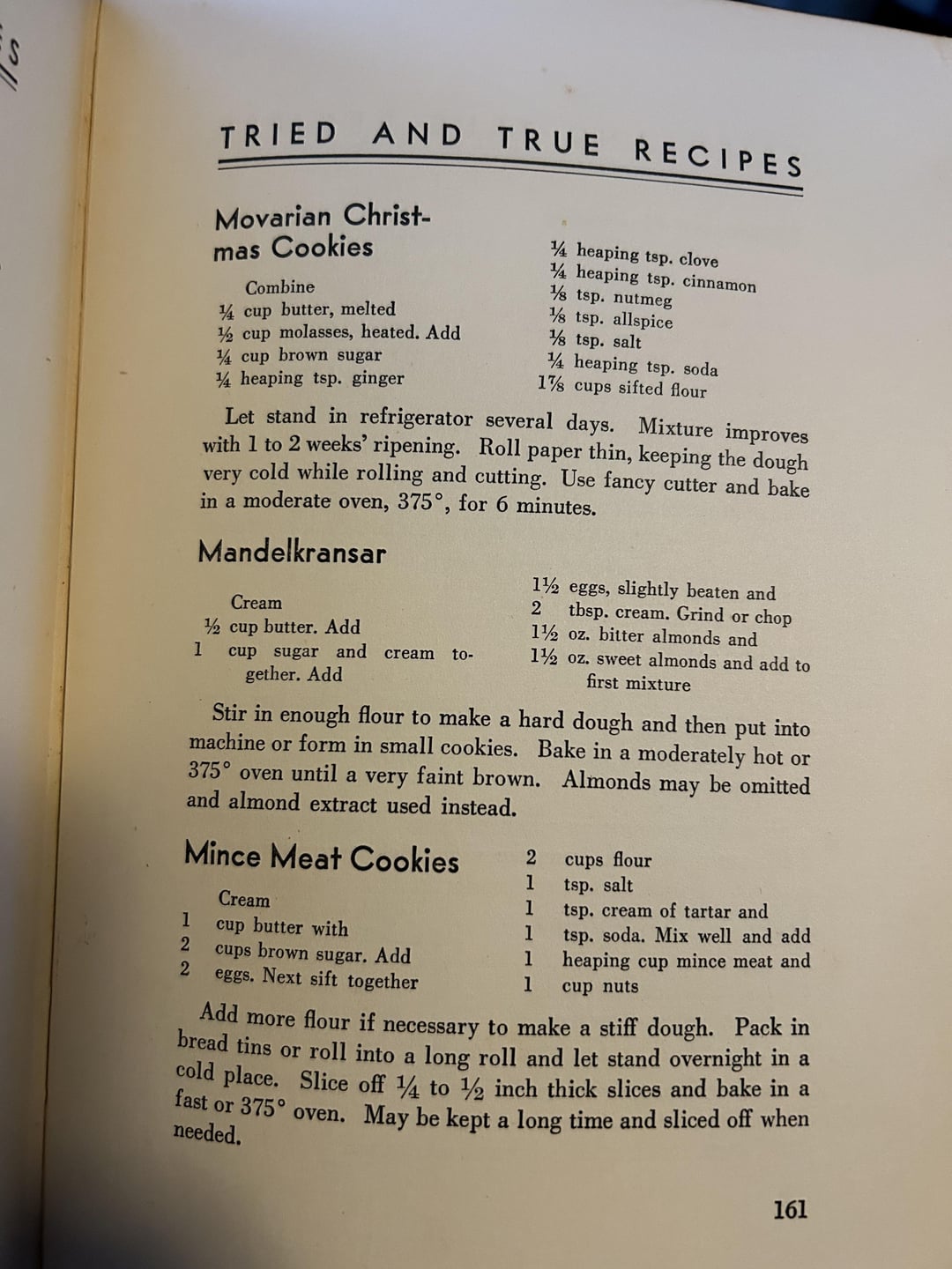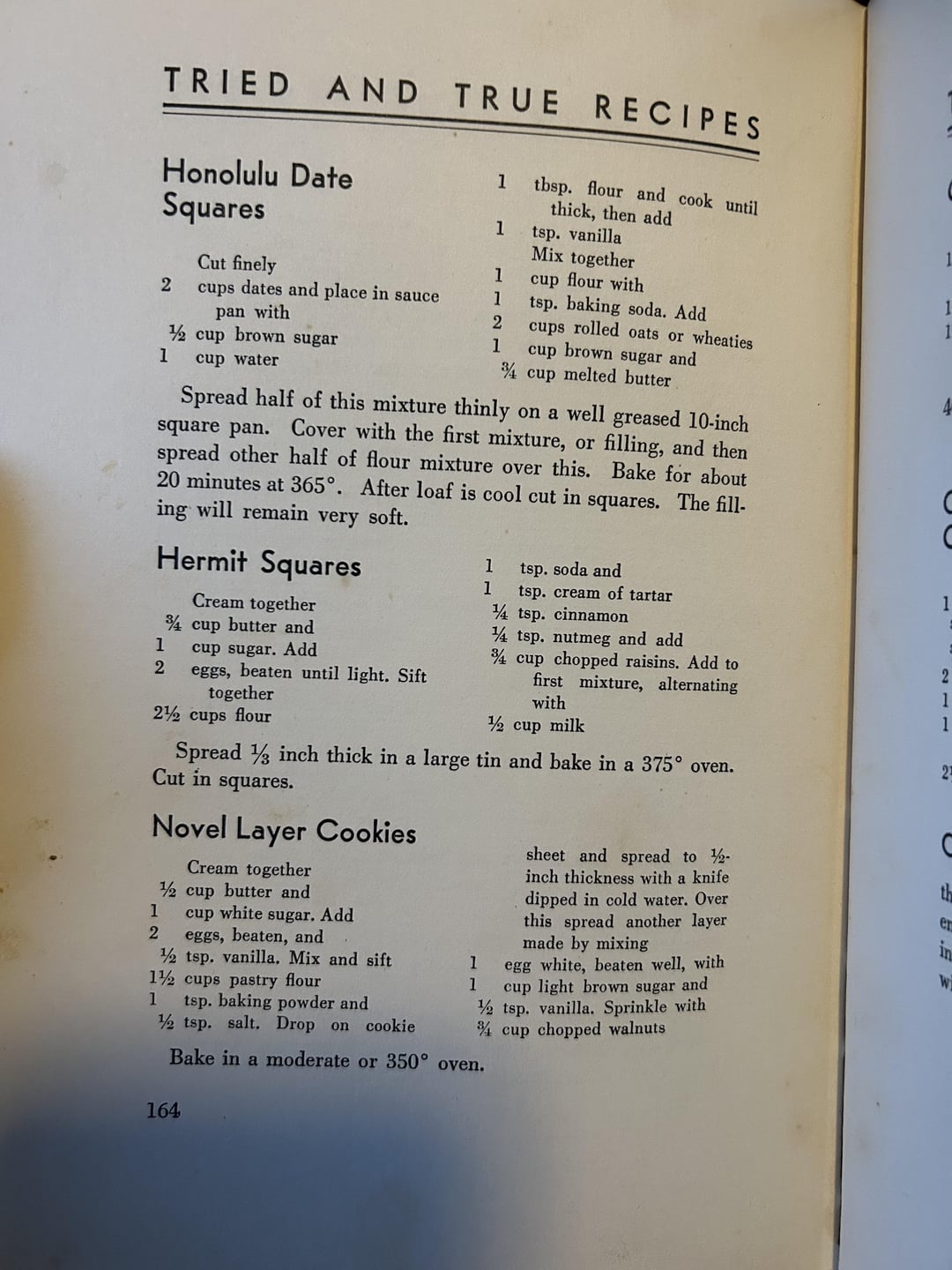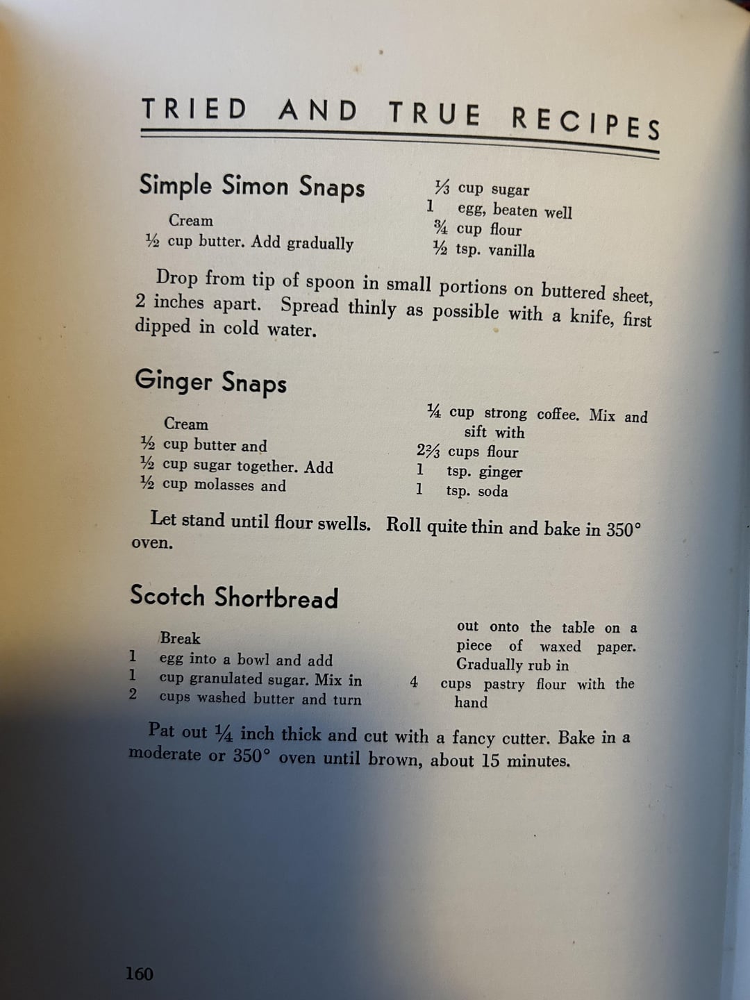This is the cookie recipes from Ruth Wakefield’s Tried and True Recipes from 1938. It includes the recipe for Chocolate Chip cookies from before chocolate chips were a thing!
