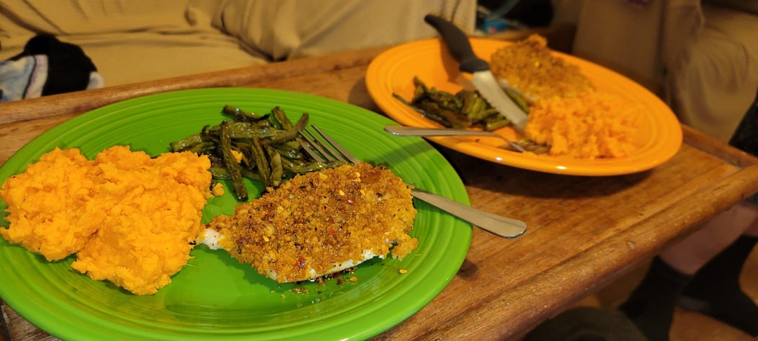 Accidentally melted my ingredients, subbed with some table maple, pantry seasonings (onion and garlic powder, smoked paprika, salt, pepper, chili flake), fresh panko and sour cream. Turned out fekkin fabulous!