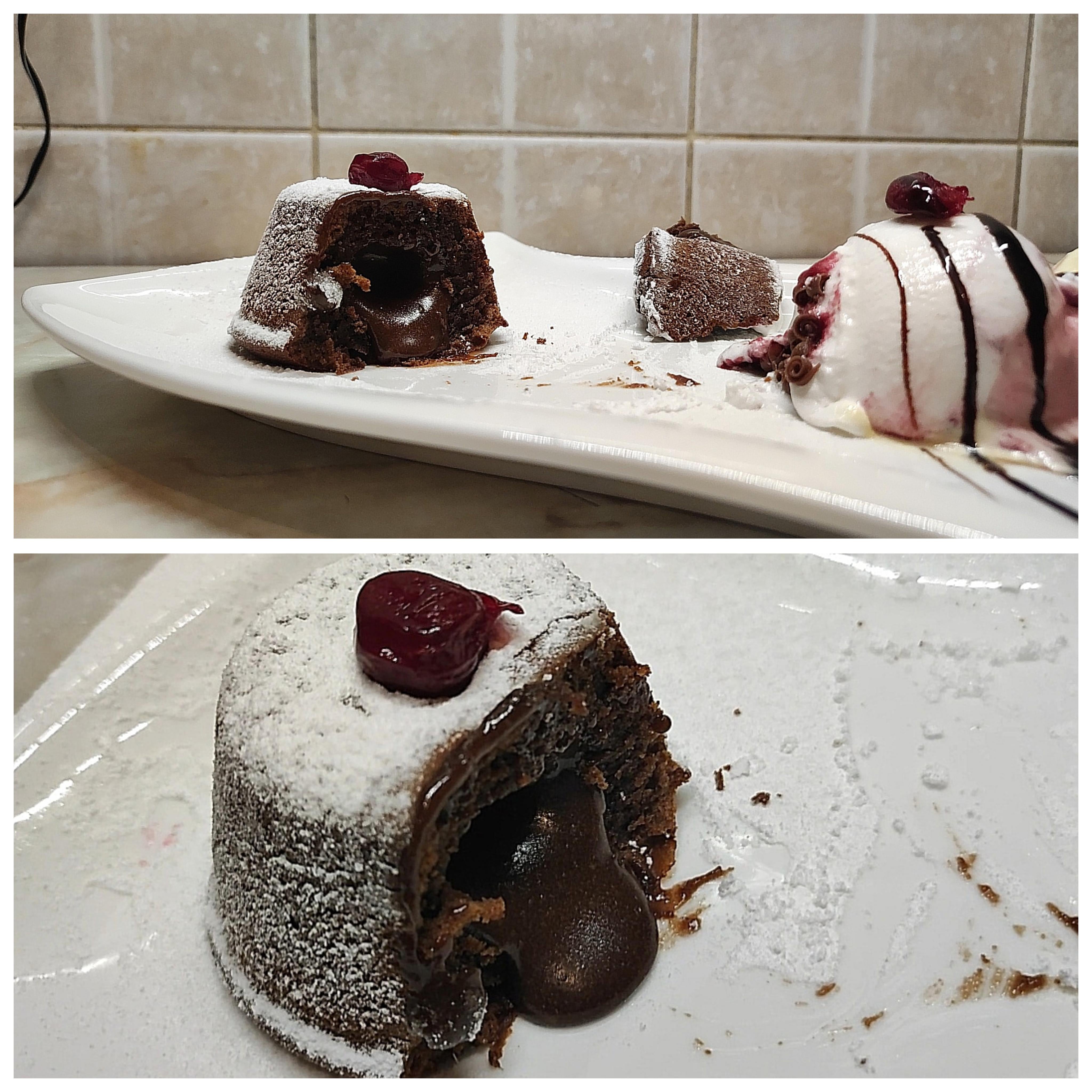 Put the butter, cooking chocolate and milk chocolate on a steamer to melt, after it melts, add a spoonful of powdered sugar, then let it cool, after it cools down, add the egg yolks and mix, then add spoonful of flour. Put the mixture in separate molds and bake for 6-7 min.