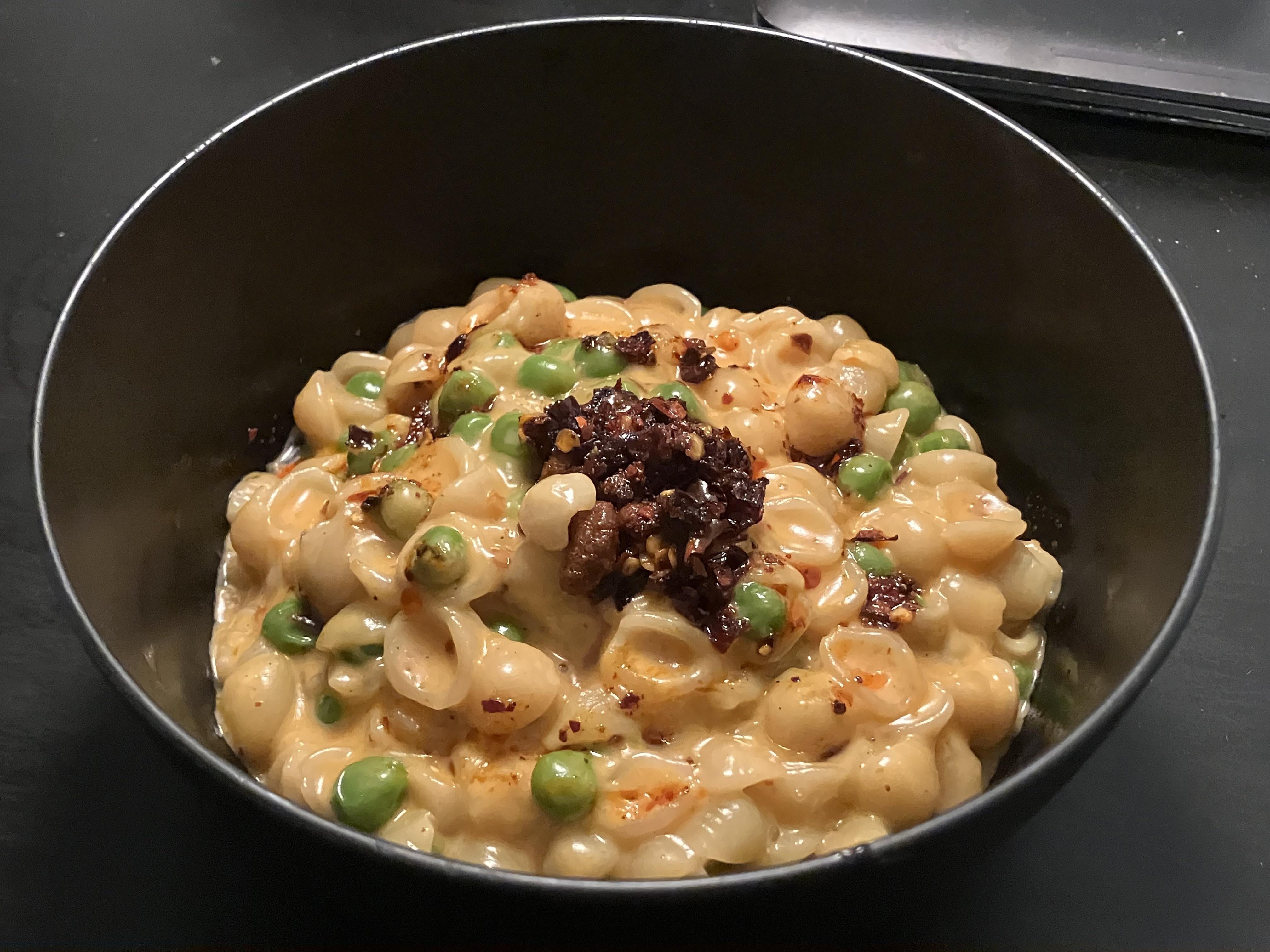 Recipe: Annie’s Aged Cheddar Mac with chili oil to taste and frozen peas, a little nutritional yeast and black pepper