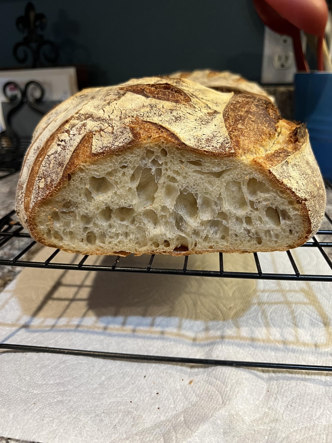 If I want a less-tough crust, I’ll cool the loaf in a pot (not the one in the oven) or wrapped in foil, etc, and it will kind of steam itself up. My crusts can shred my mouth if cooked open-air in a dry room. Most of the time I let it happen too.