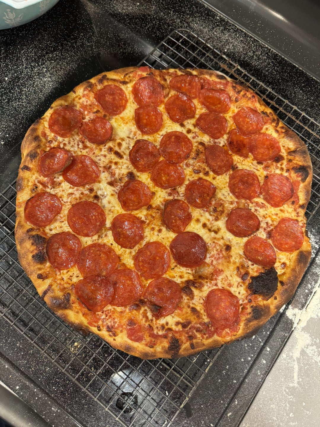First time making pizza. Been lurking on this sub taking notes recently. Still lots of room for improvement but was really happy with how they turned out. Any tips/critiques welcome