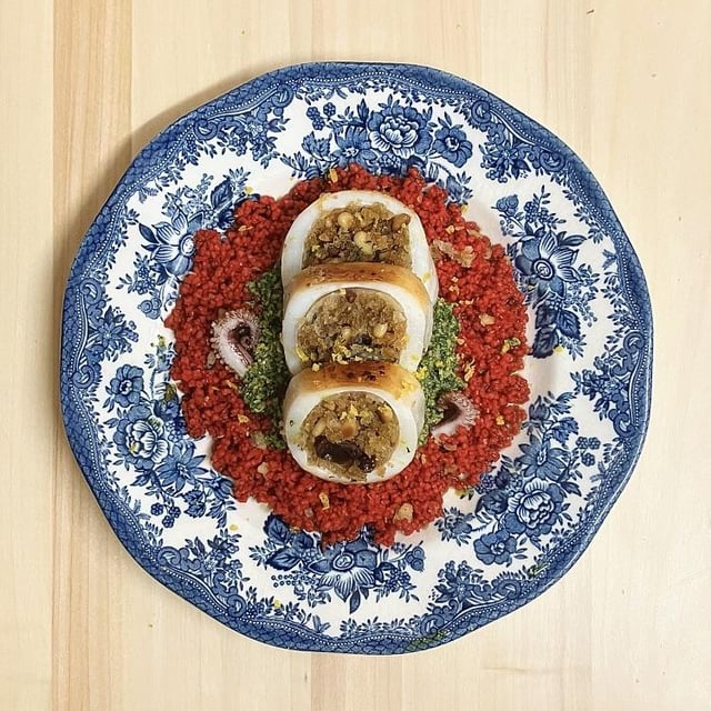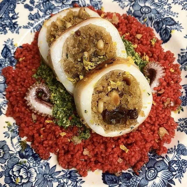 Sicilian-stuffed Squid with Arugula Pesto, Beetroot Couscous and Herb Oil