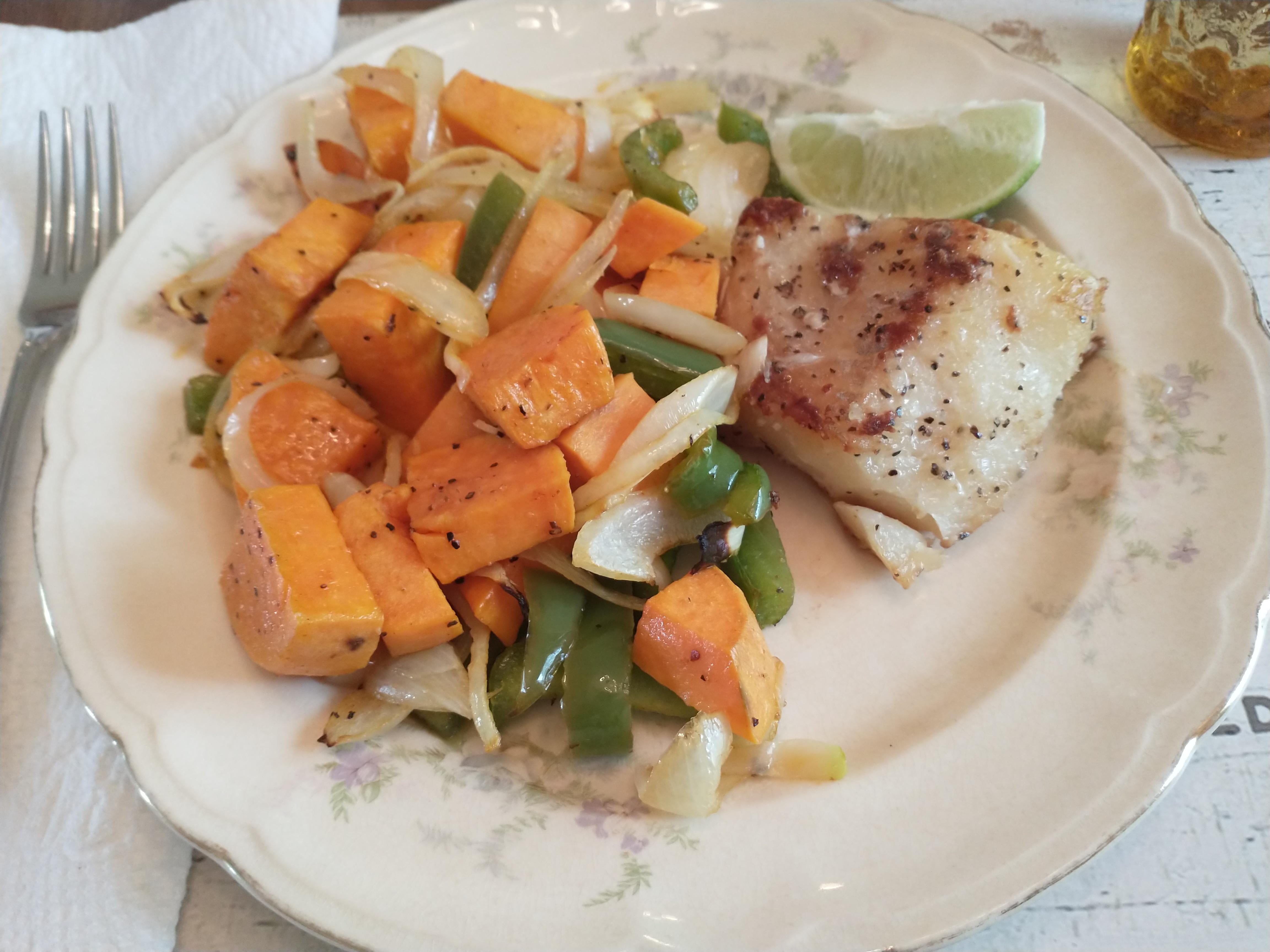I used Hello Fresh cooking techniques for a sweet potato, green pepper & onion jumble roasted in oven, and pan-fried cod. Seasoned veggies with avocado oil, salt, pepper & Buffalo Seasoning; fish is seasoned only with salt & pepper, and cooked in avocado oil.