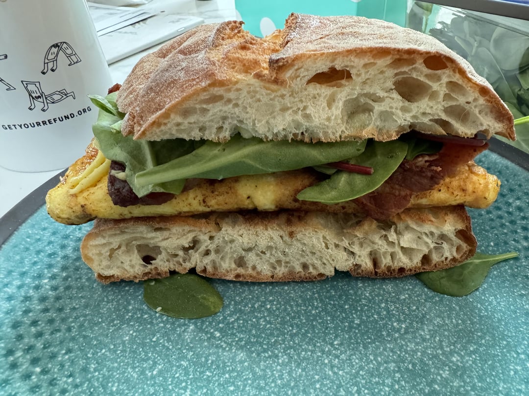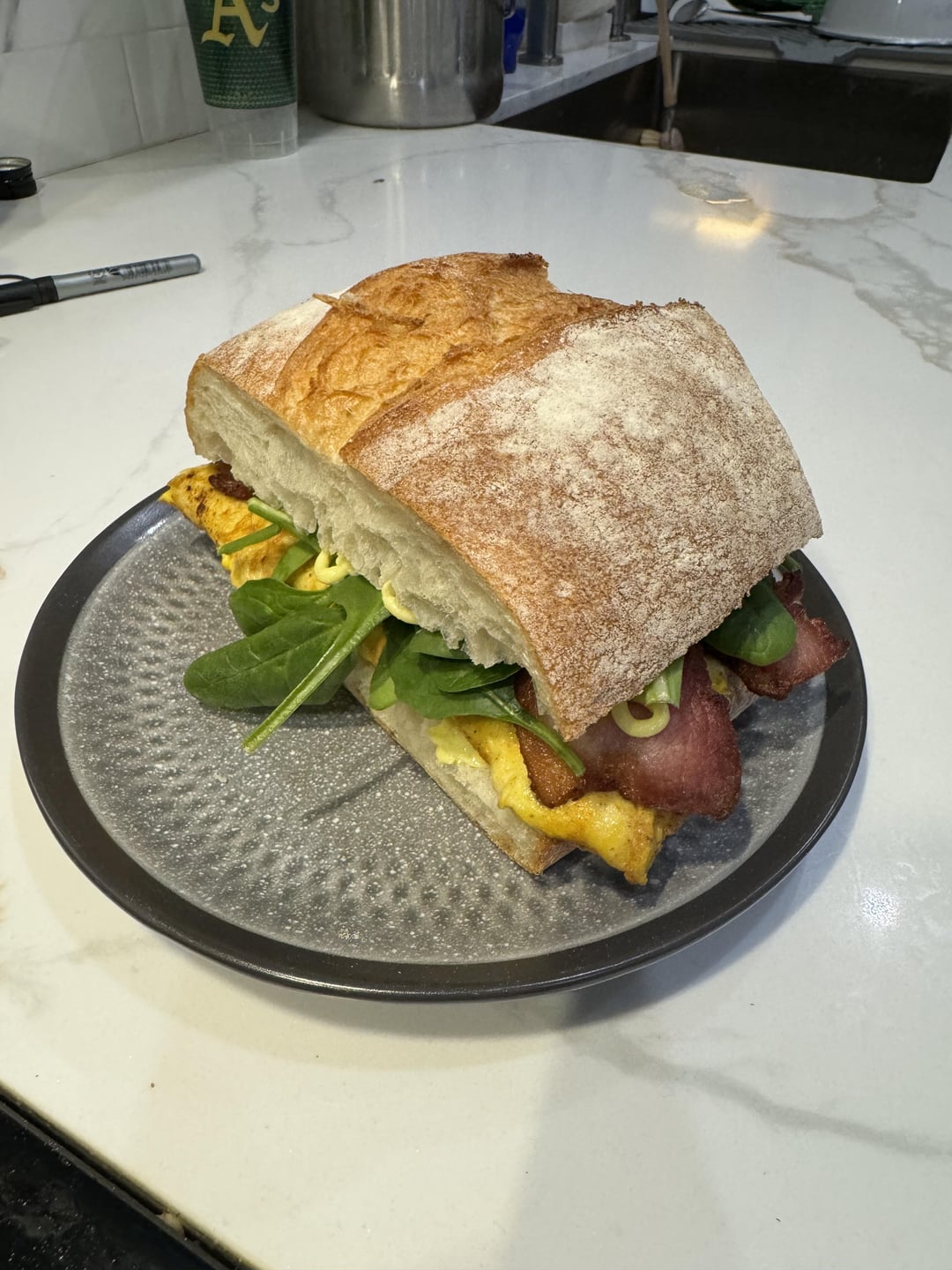 extra garlicy aioli, bacon, spinach, omelet with chili oil, on ciabatta. I use a wok to cook the bacon, drain the oil, then make the omelet in the grease. the bowl of the omelet makes it easy to fold over into rectangular shape. best wok ever