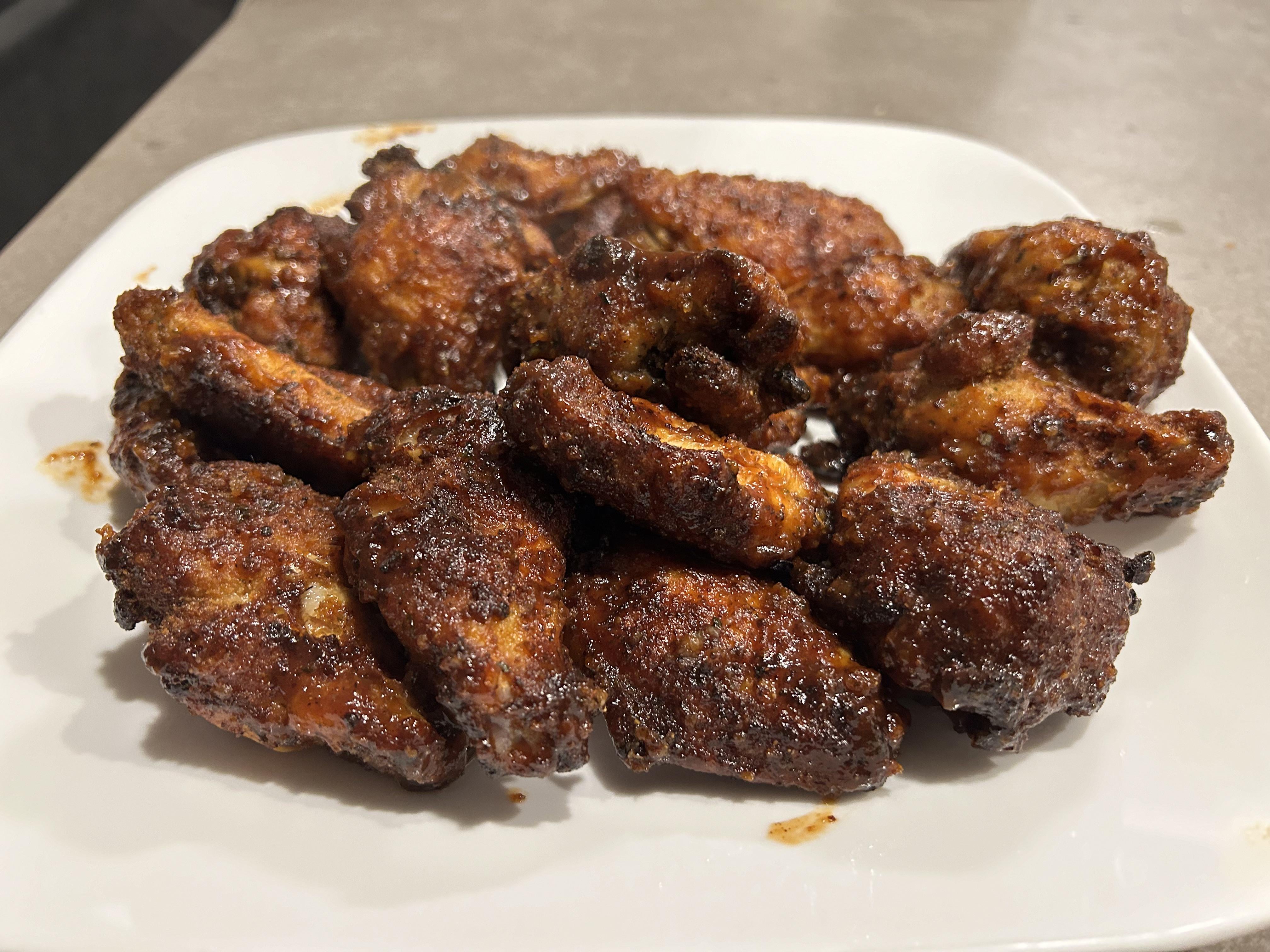 Finished in an air fryer, sauced before. Maybe fried or grilled before but definitely Finished in an air fryer.