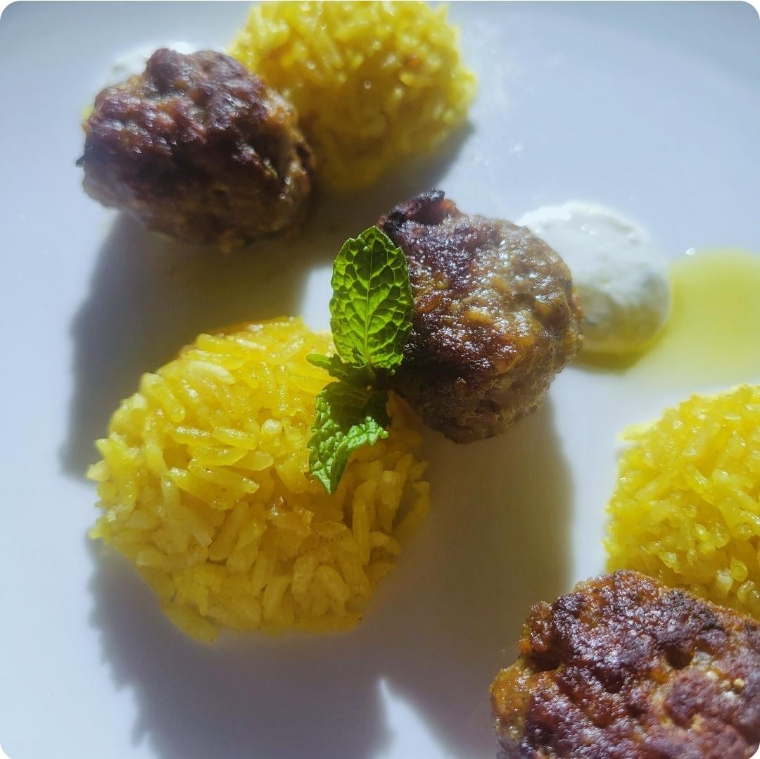 Not considering the photography aspect, I think you could make it look more enticing to the eye. Right now everything has a yellow hue to it, the meatballs are kind of yellow, your EVOO is yellow and covering the tzatziki, and ofc the rice is very yellow. Makes it look bland and not super appetizing. Maybe instead of using plain EVOO you could make a chili or harissa oil infusion for some bright red. Pomegranate, pickled red onion, something to contrast the pale yellow.  Also would recommend not just clumping three similar sized spheres together – my eyes not really drawn to anything in particular. You could do a tzatziki smear around the plate, anything to draw and guide the eye. my stomach suggests perhaps a bigger meatball?