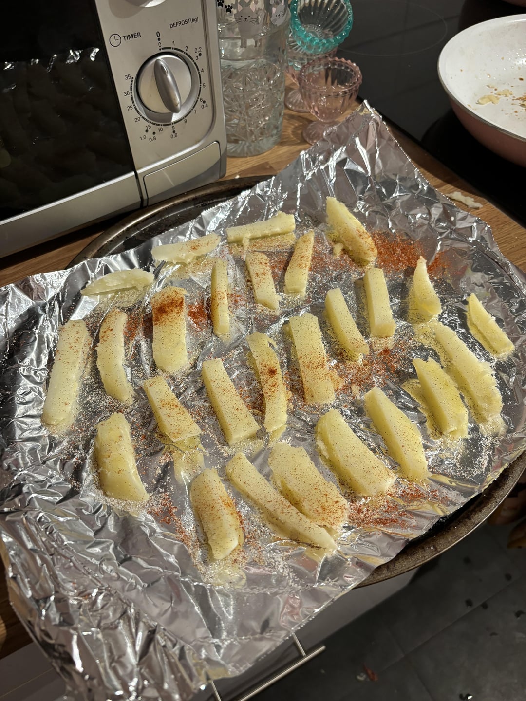 I then covered them in 1 tsp olive oil and placed them on the baking tray, adding salt, pepper and paprika.