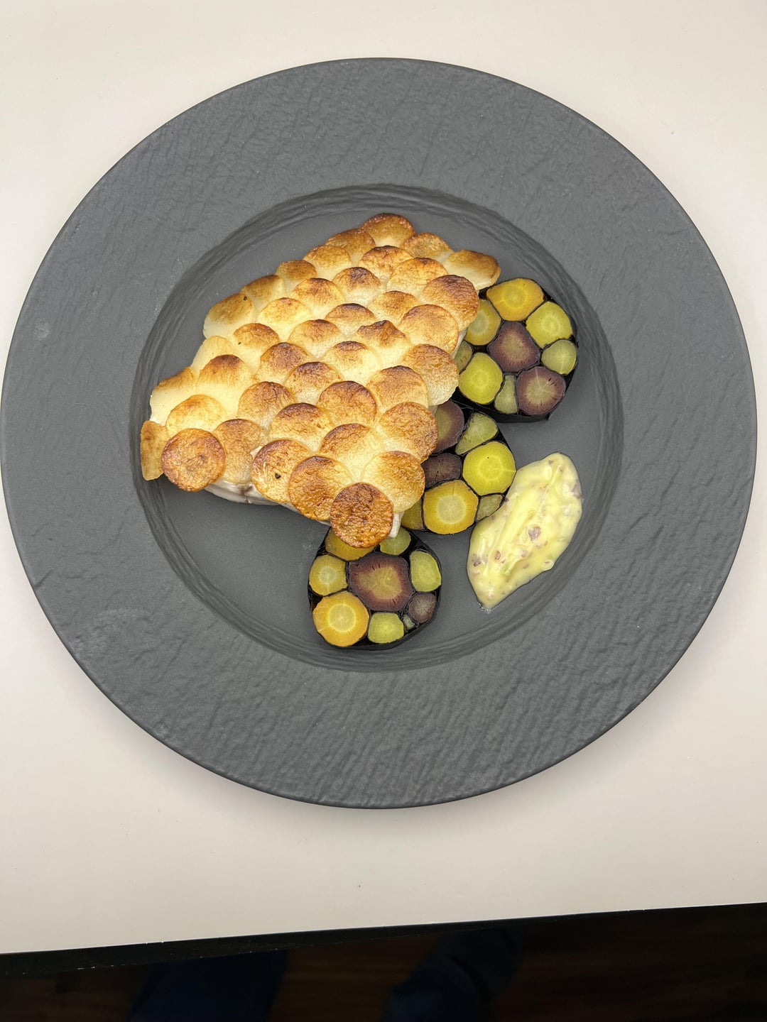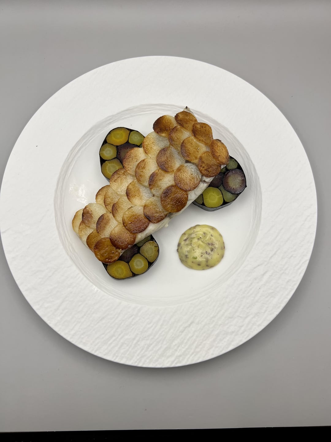Potato Scale Barramundi, Carrot Mosaic, Seaweed Butter. 2 ways
