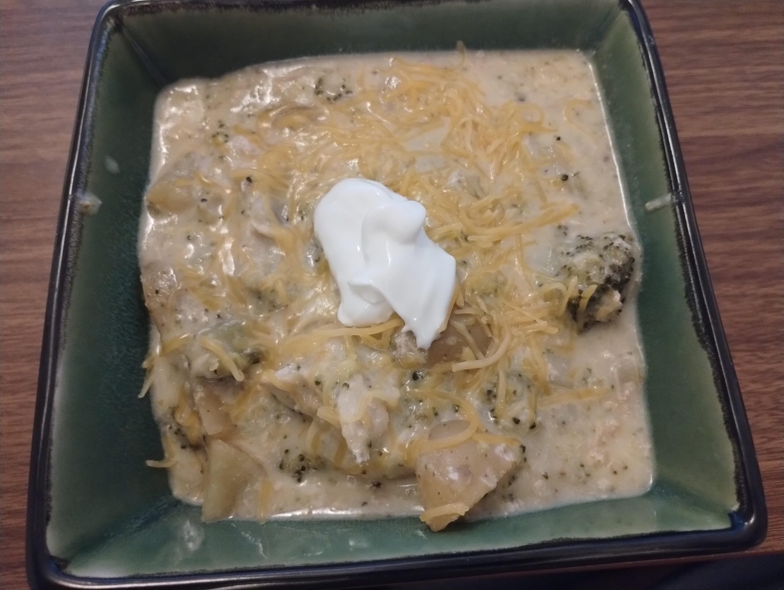 go_ninja_go 2 years ago https://www.delish.com/cooking/recipe-ideas/recipes/a57706/crock-pot-cheesy-chicken-broccoli-soup-recipe/