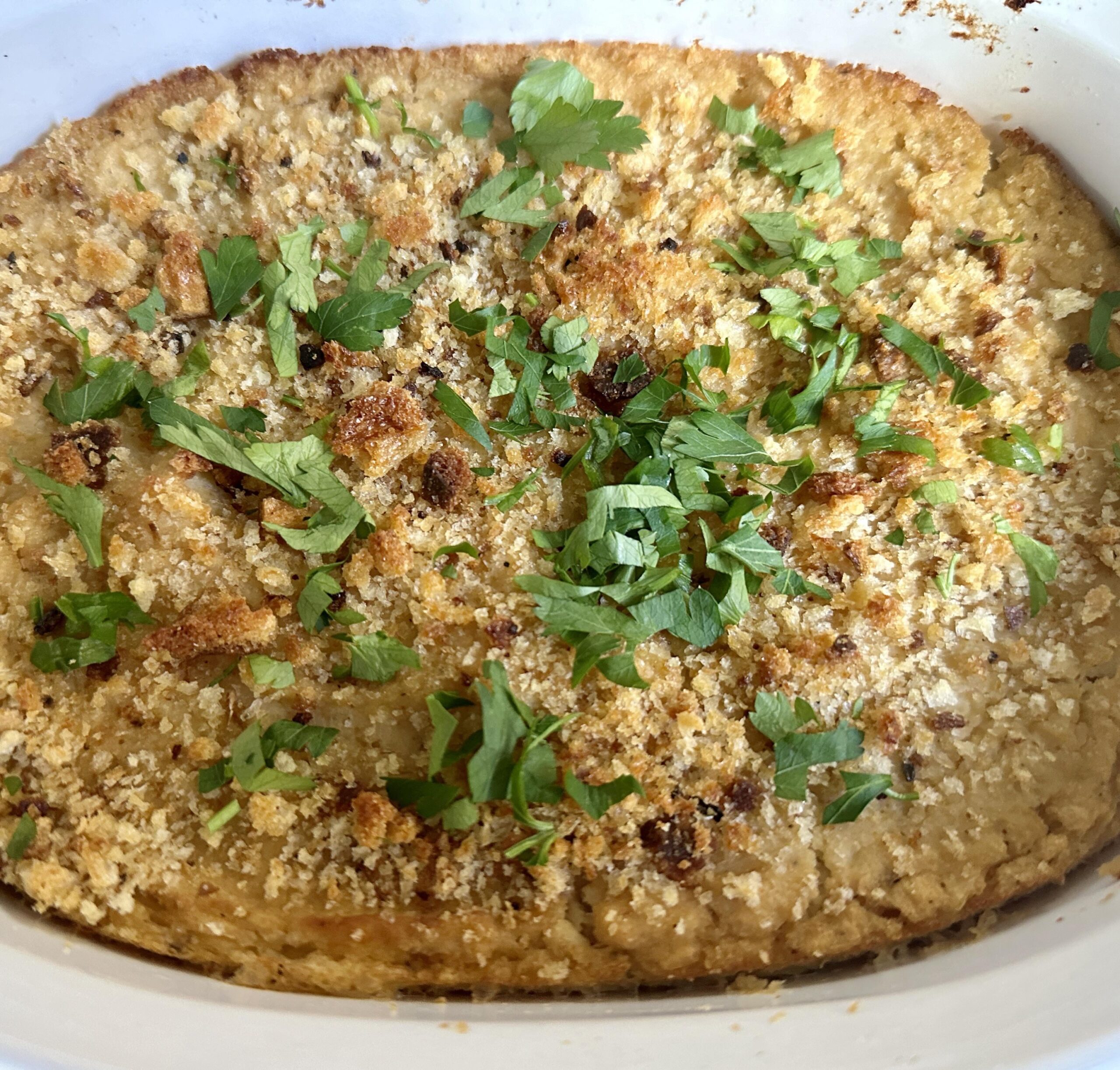 Whip it up then into a baking dish. Top with coarse bread crumbs and bake for 20 or so minutes at 350 or until browned.