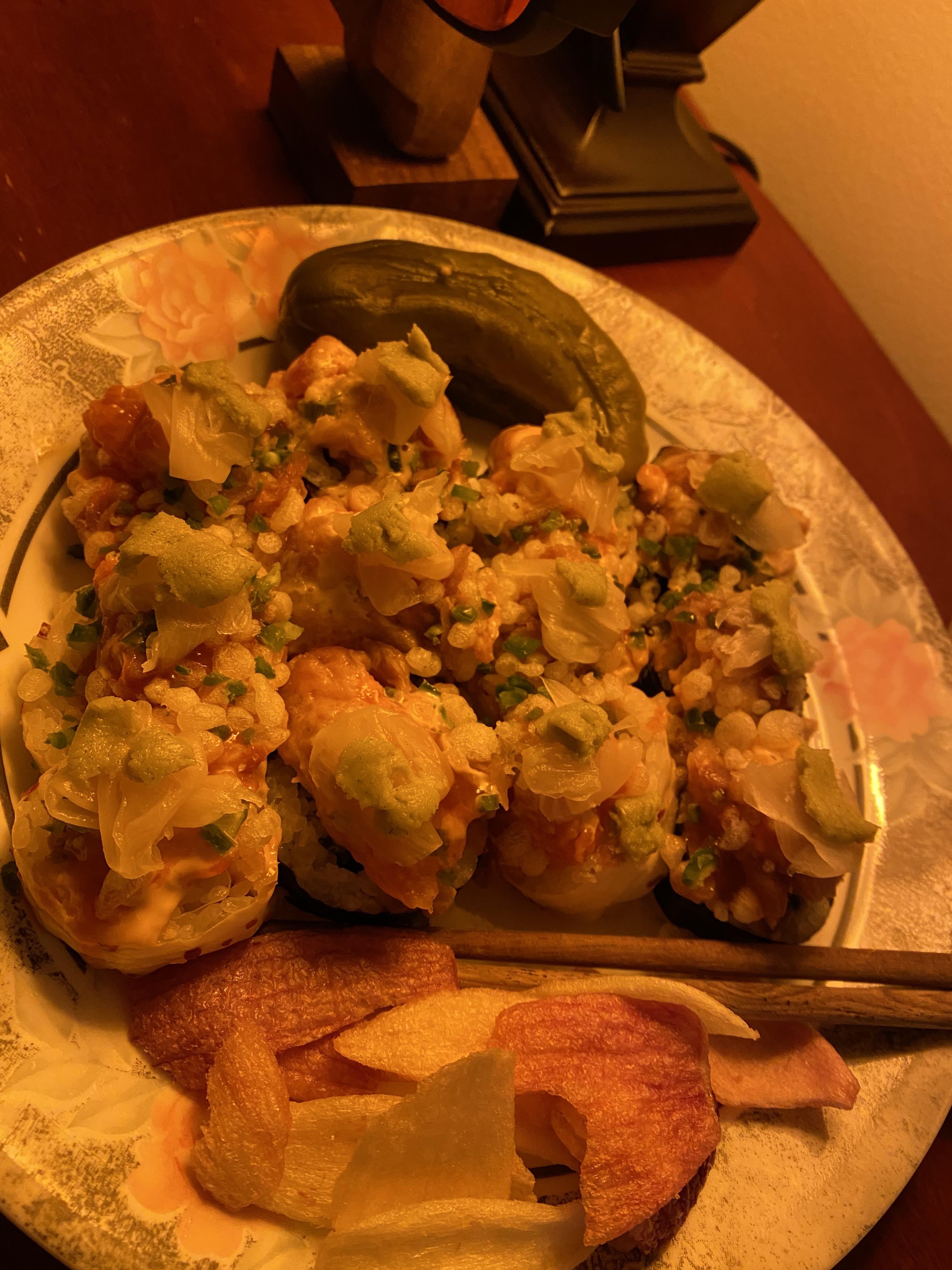 I’m having fresh wegmans sushi for dinner along with a fermented dill and onion chips. Never tried them before and they’re pretty damn good. They’re basically just red and white onions that are baked + salted.