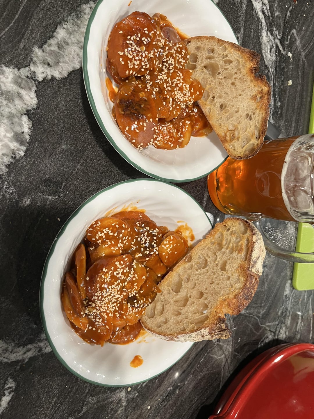 I was going to make normal tteokbokki but the market only had the oval rice cakes. The shape made me think of sliced sausage and I already had kielbasa in the fridge. I figured it would be a bit like sotteok (but in tteokbokki form—in the sauce I used veg stock instead of dashi and hatch chili powder + smoked paprika instead of gochugaru). Will definitely be making this again.