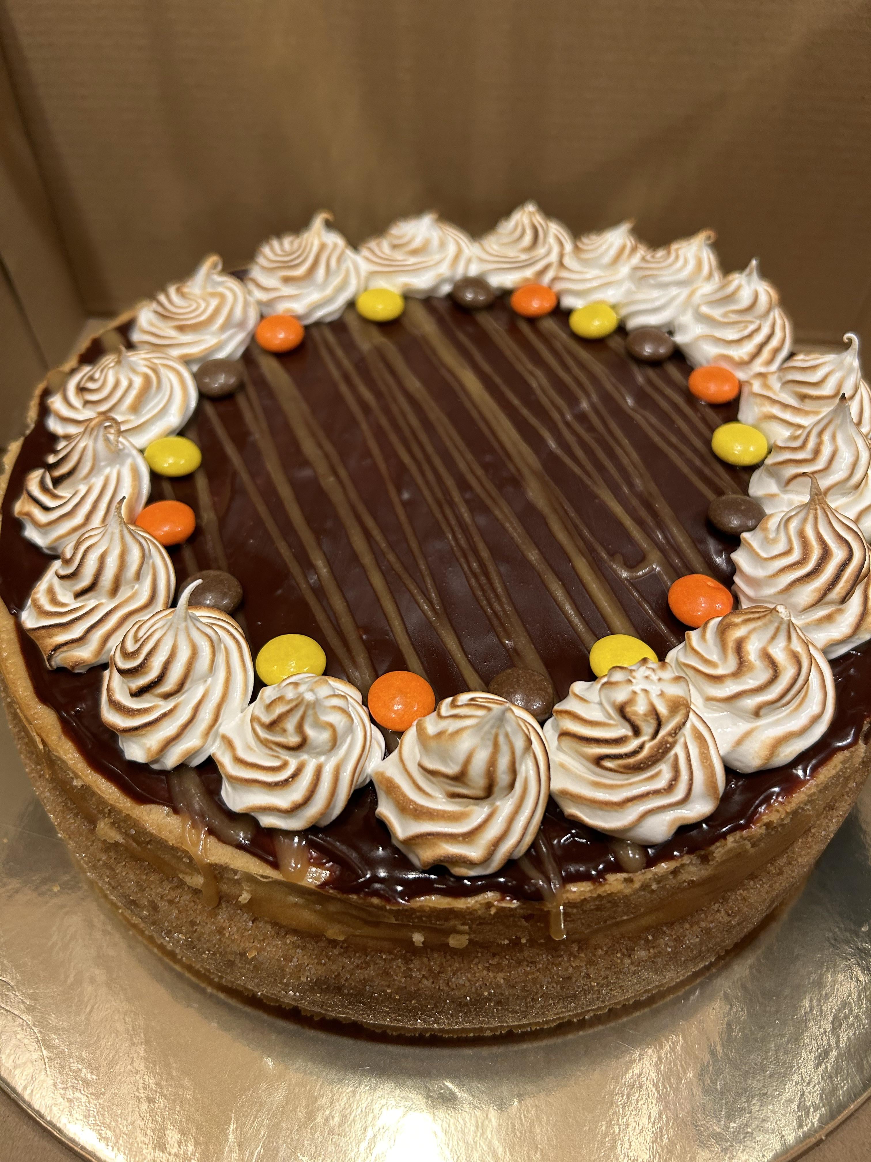 A peanut butter cheesecake with a traditional graham cracker crust, chocolate ganache, a peanut butter sauce drizzle, and toasted Swiss meringue