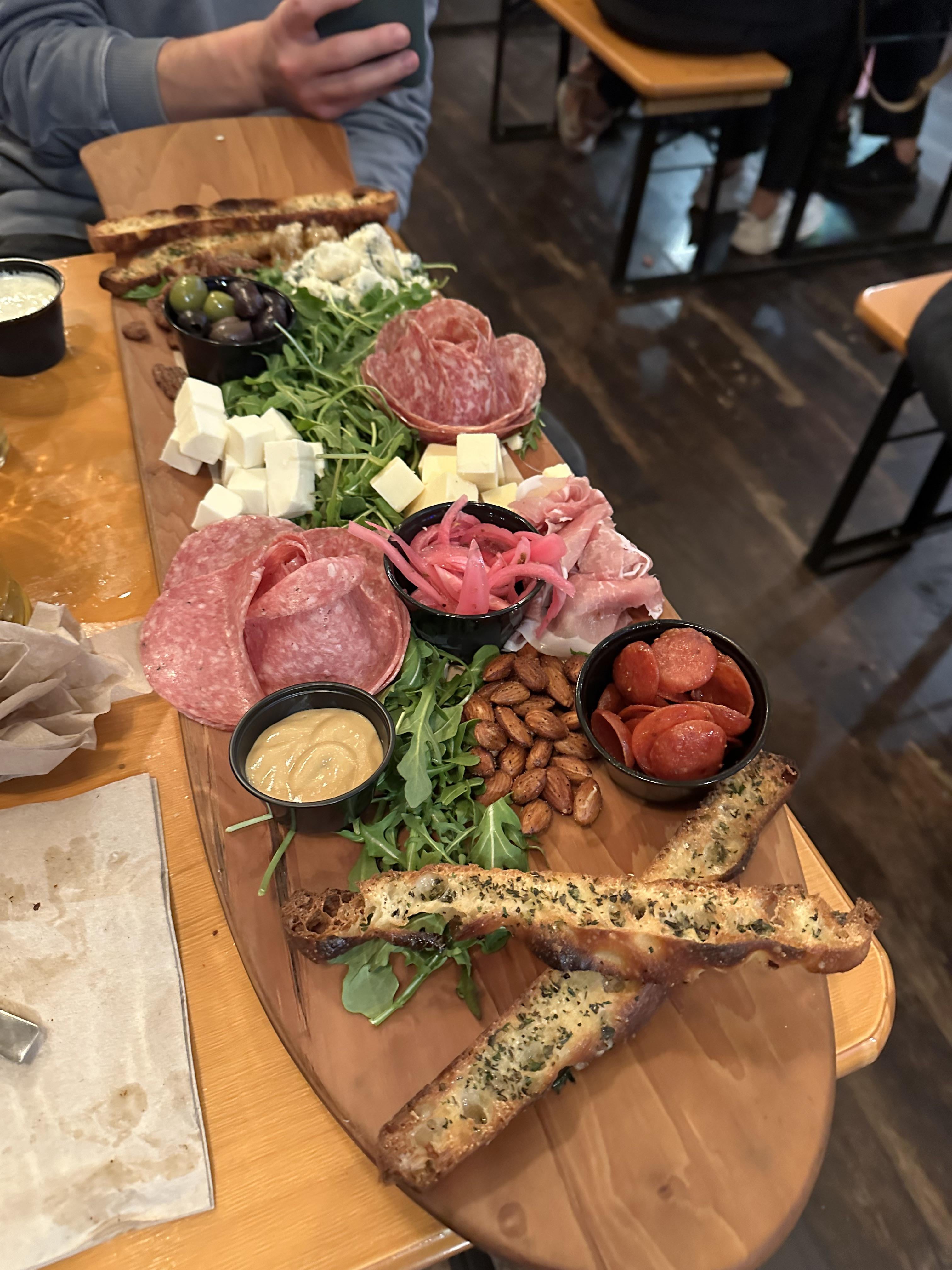 Big crack running down the board collecting bacteria for months. Plastic ramekins. These skinny bread cuts make no sense for charcuterie. Throw some wheels on that board and skate tf out of there