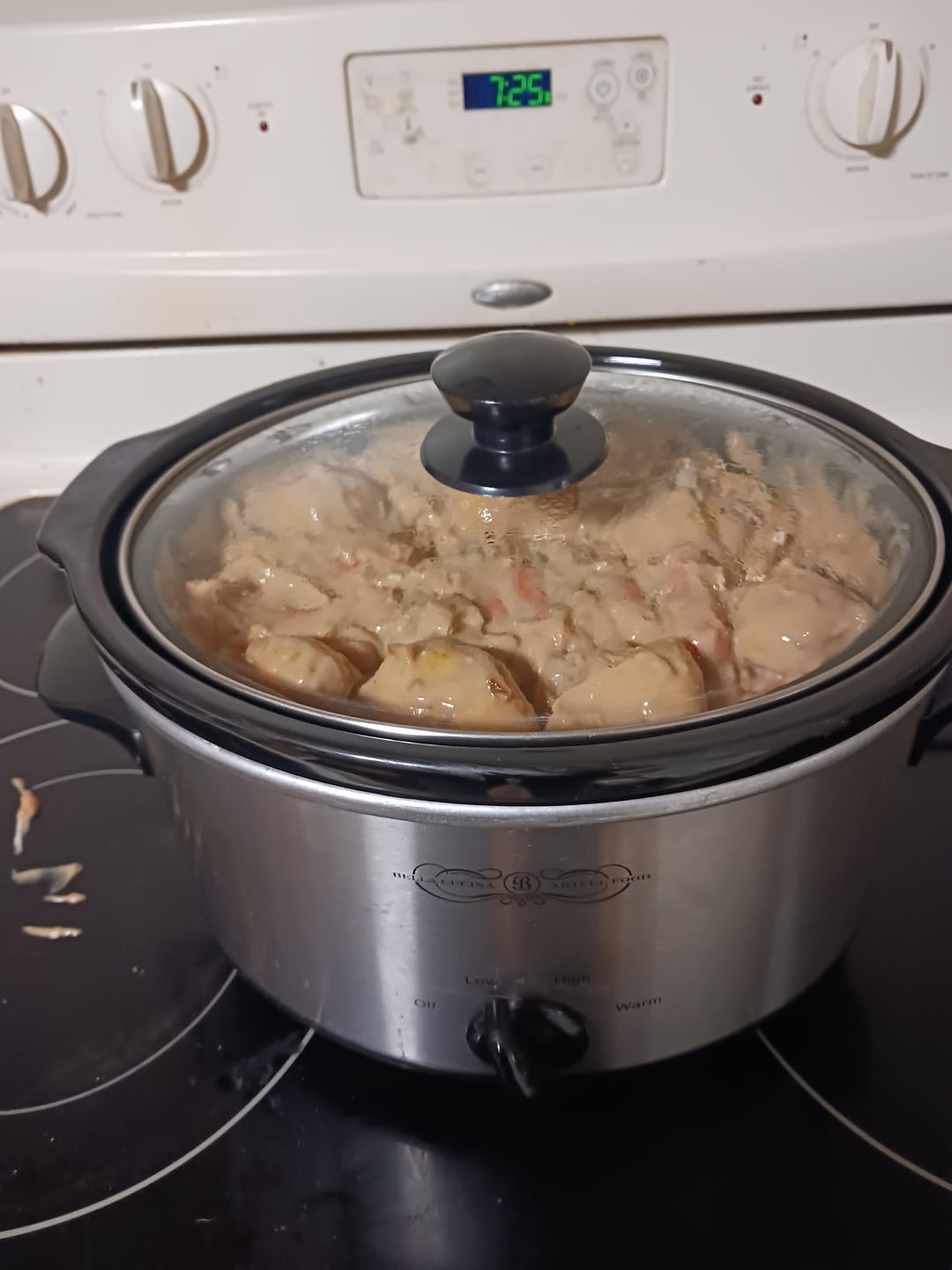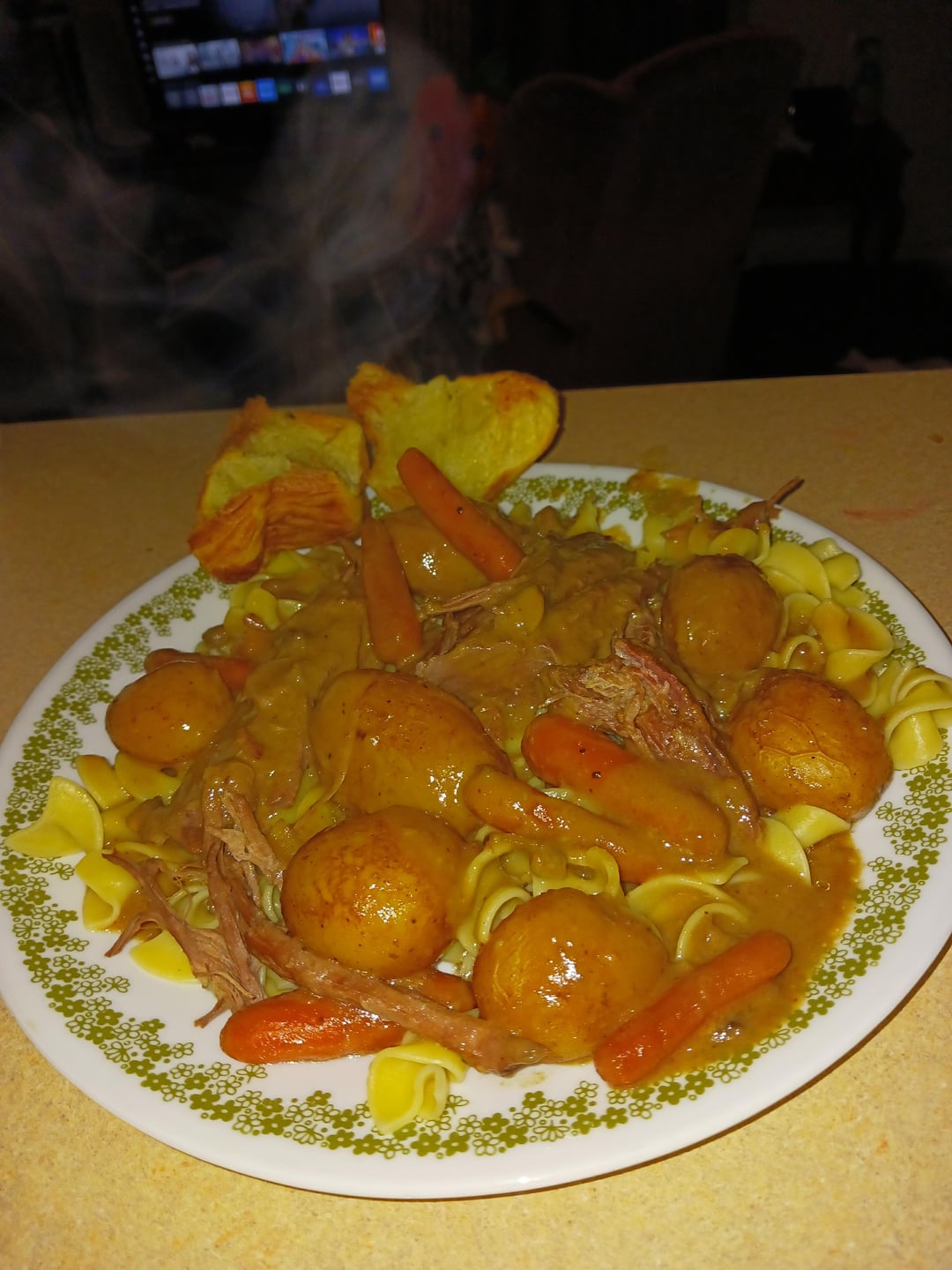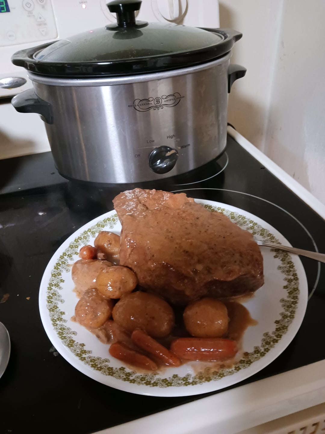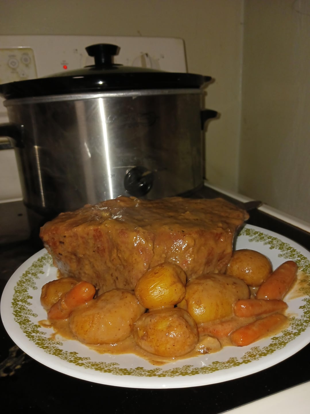 Tonight was a 2.9lb bottom round roast. Fit perfect or just barely. Tender fall apart meat after 9hrs. I chopped up white mushrooms and used lower sodium gravy mix. Light n fluffy noodles filled the plate and soak up gravy.