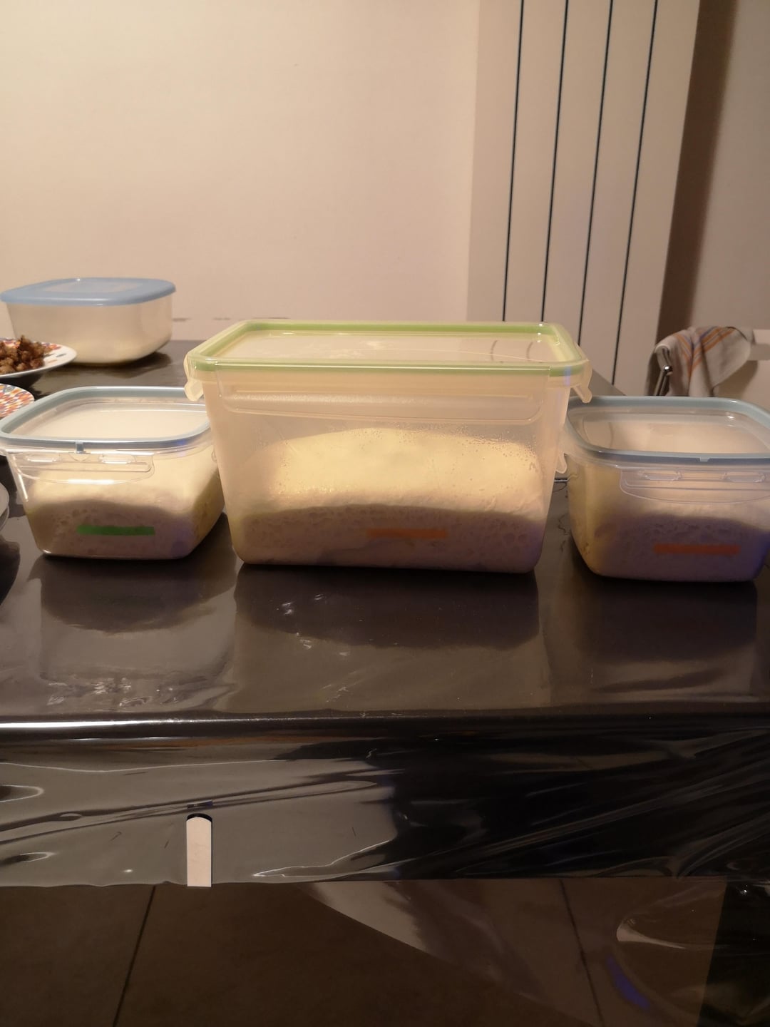 First I made a preferment mixing the flours with 650 g of water and the 10 g of yeast. I let it fermentate in the fridge for about 18 hours.