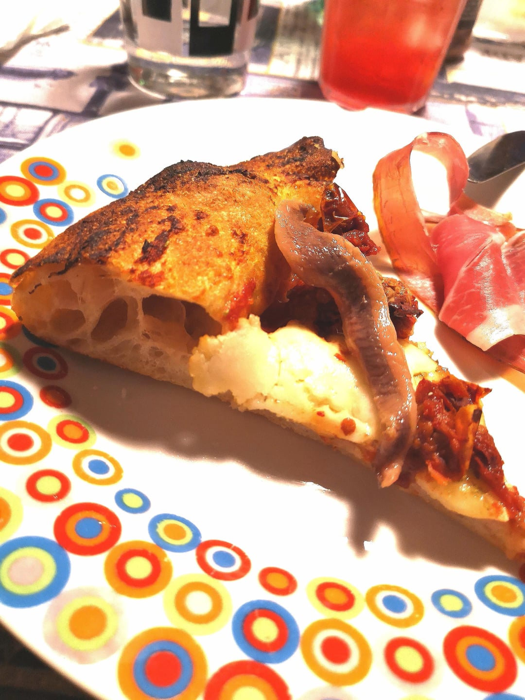 Toppings: tomato sauce, fiordilatte, primosale cheese (sheep milk), dried tomatoes oregano and anchovies on the slices.