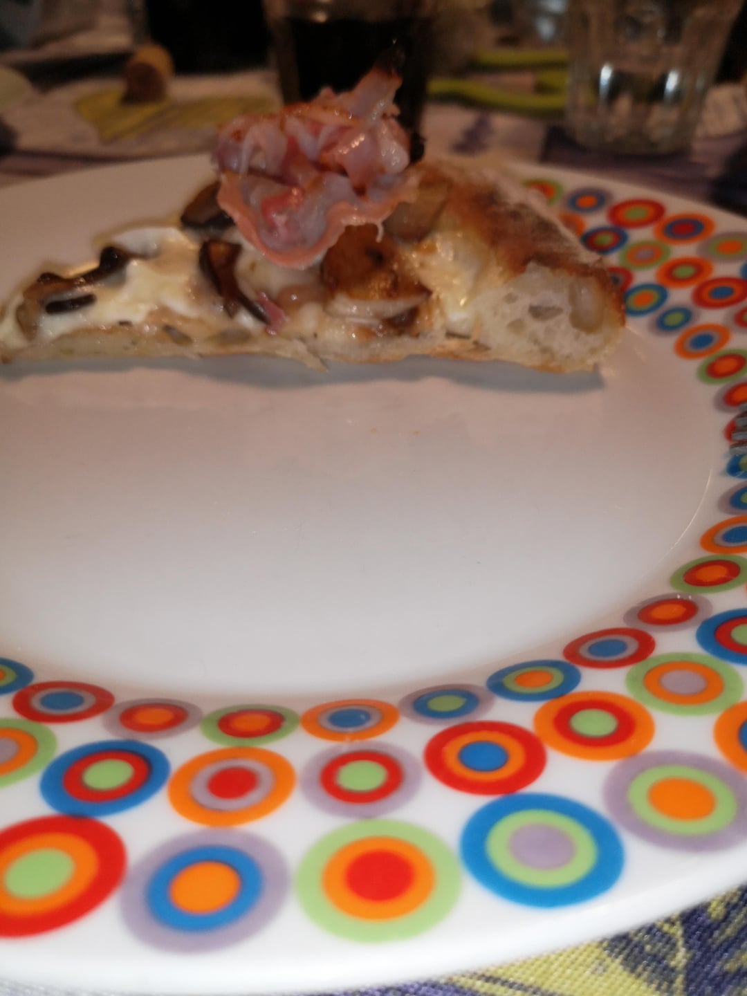 Toppings: fiordilatte, pancetta, mushrooms (cardoncelli), goat cheese.