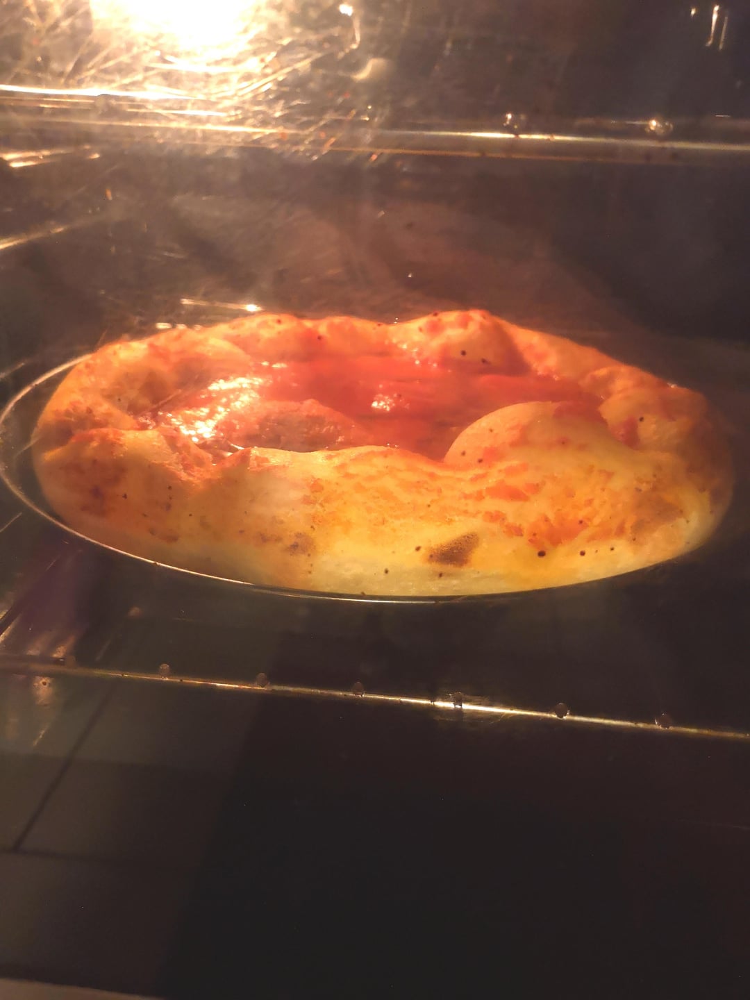 The first pizza was baked without the stone, first on the lowest part of the oven, on the oven rack, then on the second highest part.