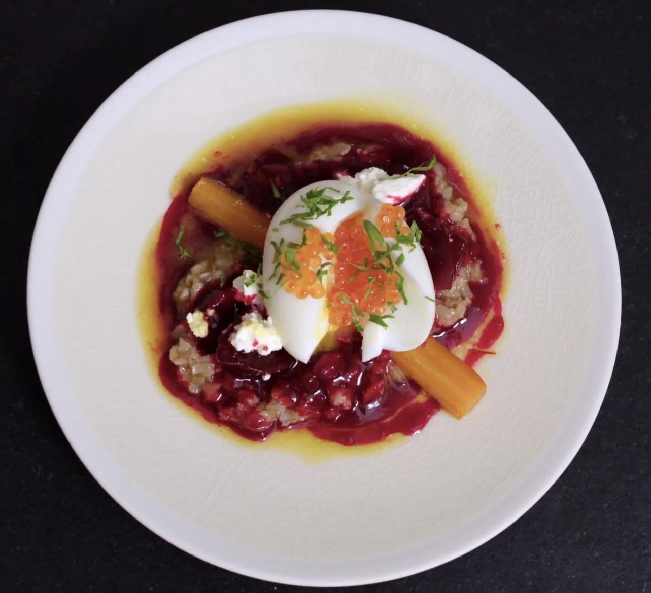 Oatmeal? And cooked beets? And caviar? And cream cheese? And is that an oil around the circumference? Soft egg? Looks very nice…. Since we’re plating…