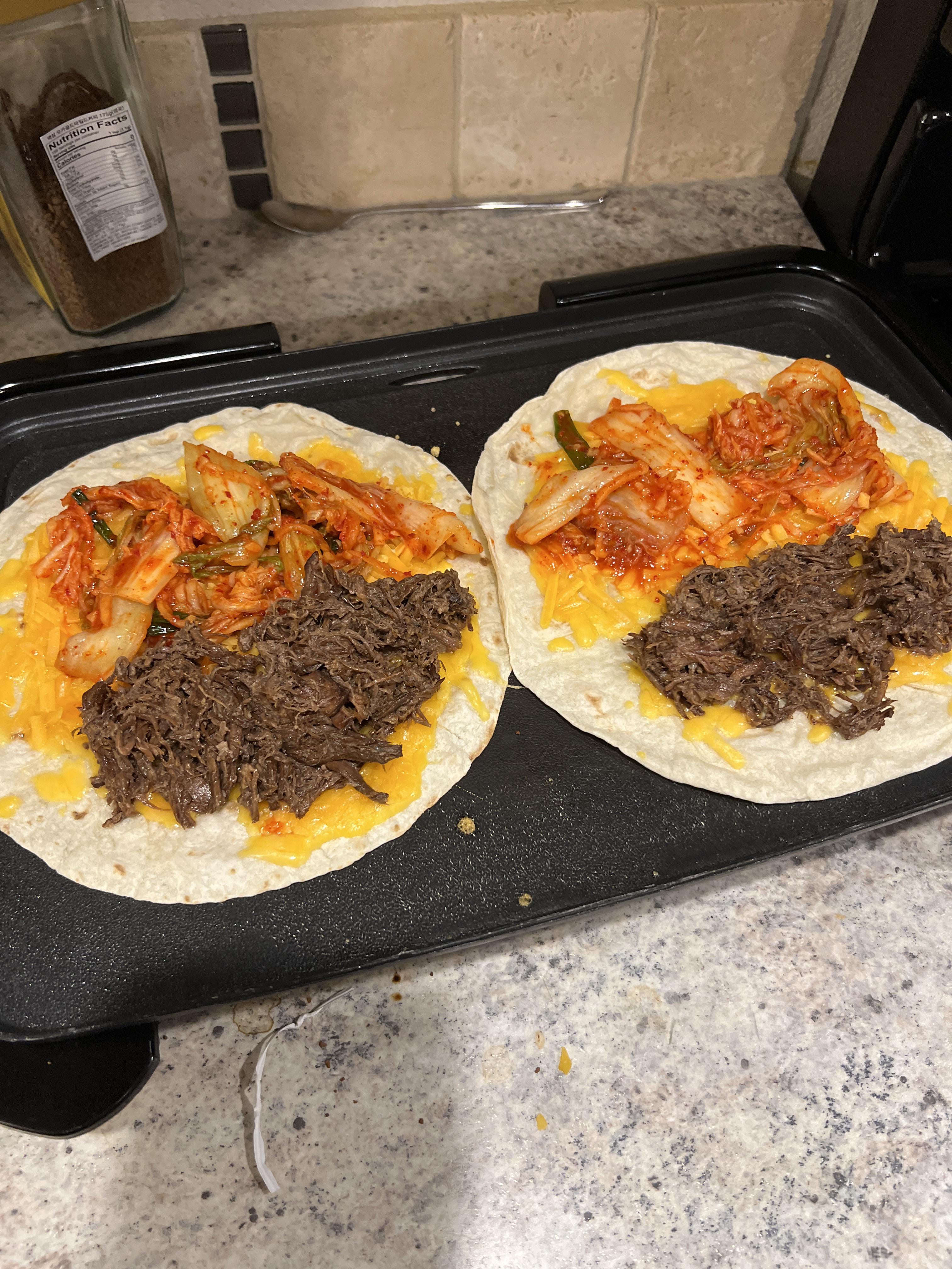 I made some kimchi a week or so ago and this past weekend the wife said she wanted birria tacos. So ive been wanting to make kimchi grilled cheese… and i thought this combo would be much better. Yes i know not its true korean food but as a korean im just trying to make some fusion foods
