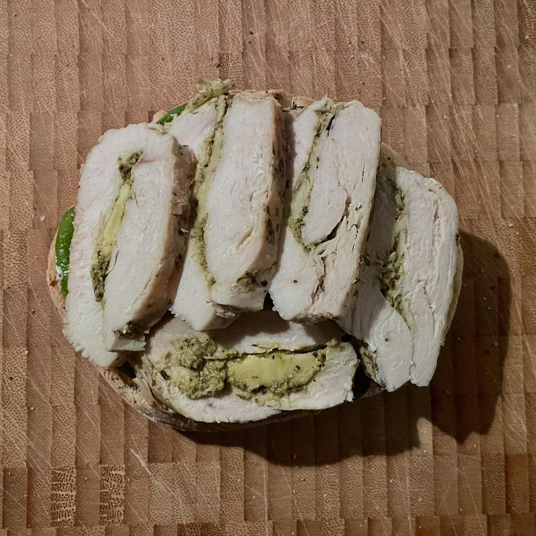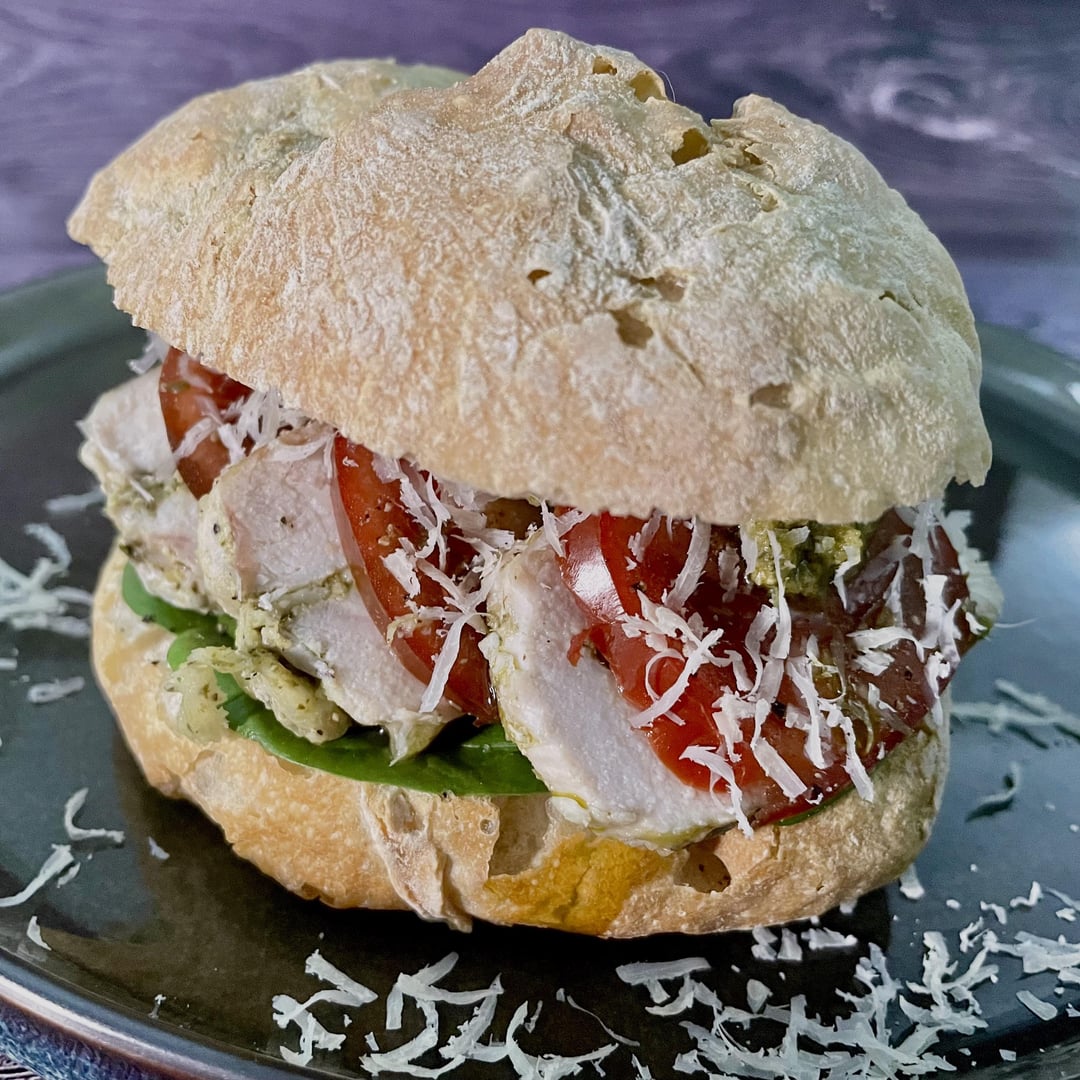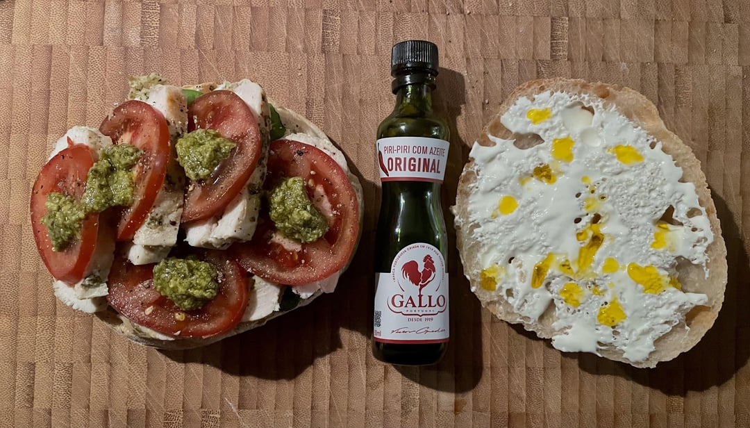 Italian-Portuguese sandwich: mozzarella and pesto filled chicken from yesterdays dinner, spinach leaves, tomatoes, more pesto and parmesan. All on a Portuguese bun, spiced up with piri piri oil