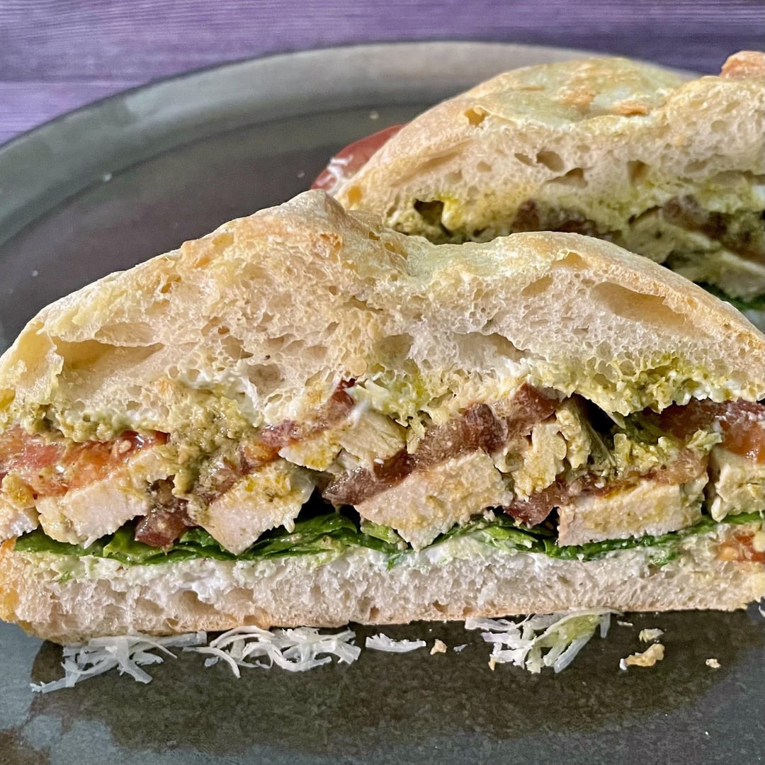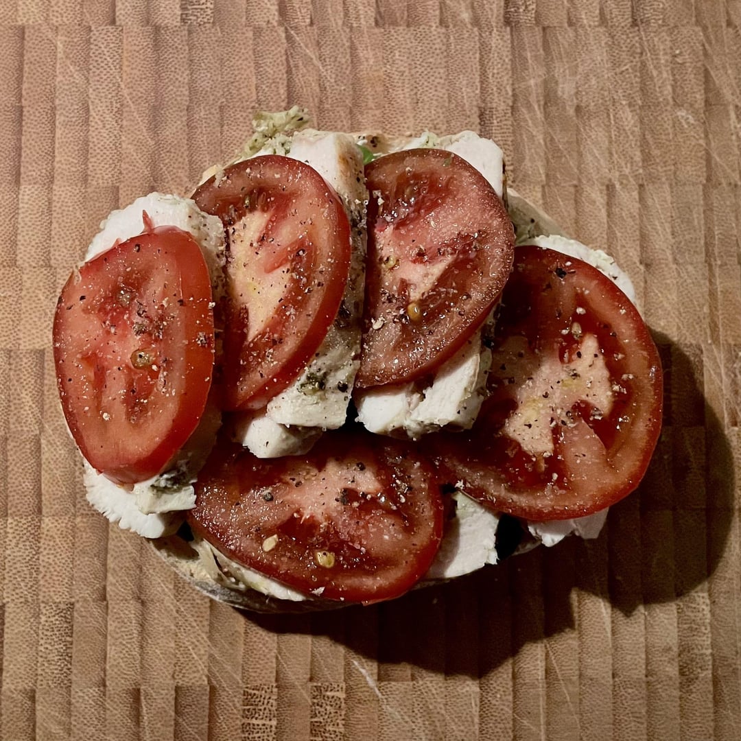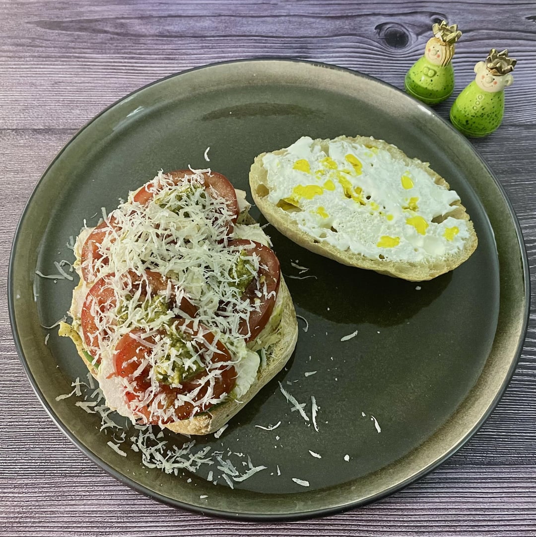 Italian-Portuguese sandwich: mozzarella and pesto filled chicken from yesterdays dinner, spinach leaves, tomatoes, more pesto and parmesan. All on a Portuguese bun, spiced up with piri piri oil