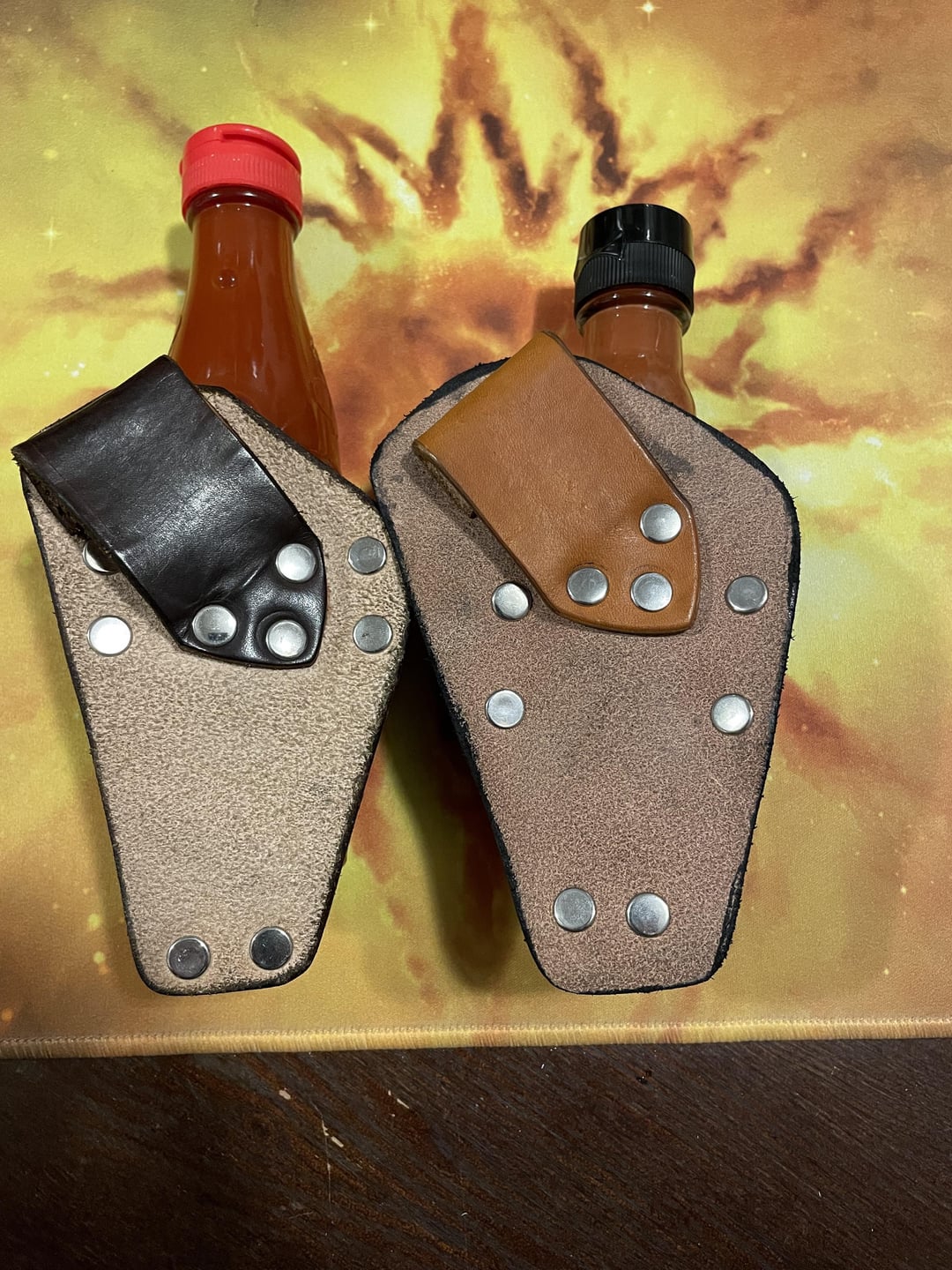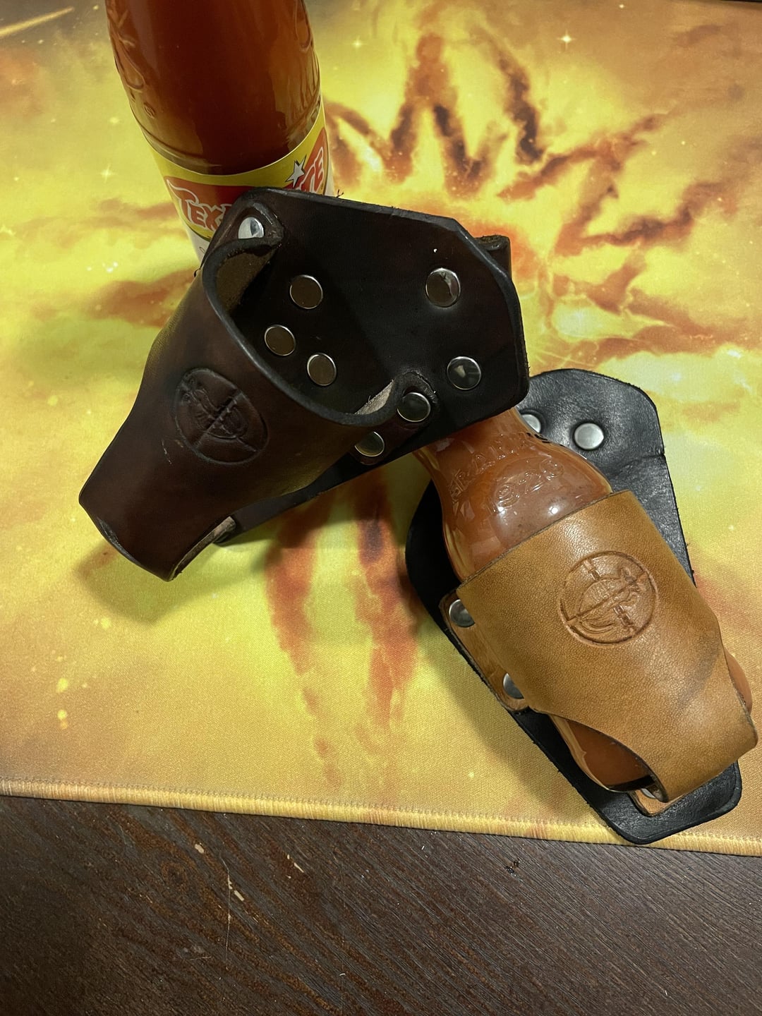 Have a good friend that does leather work. He mainly does things like belts, holsters, knife sheaths, etc. I asked him to make me some hot sauce holsters and he came through splendidly even though that was a new one for him haha. Don’t give me grief it’s just Texas Pete and franks red hot, I like them both and figured those were pretty standard sized bottles other hot sauces could fit into the holster as well.