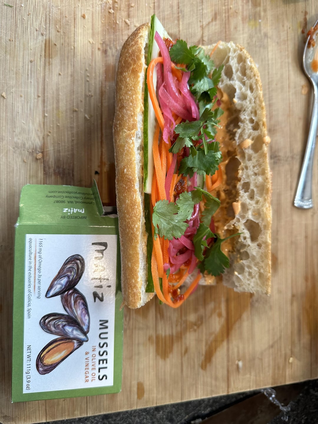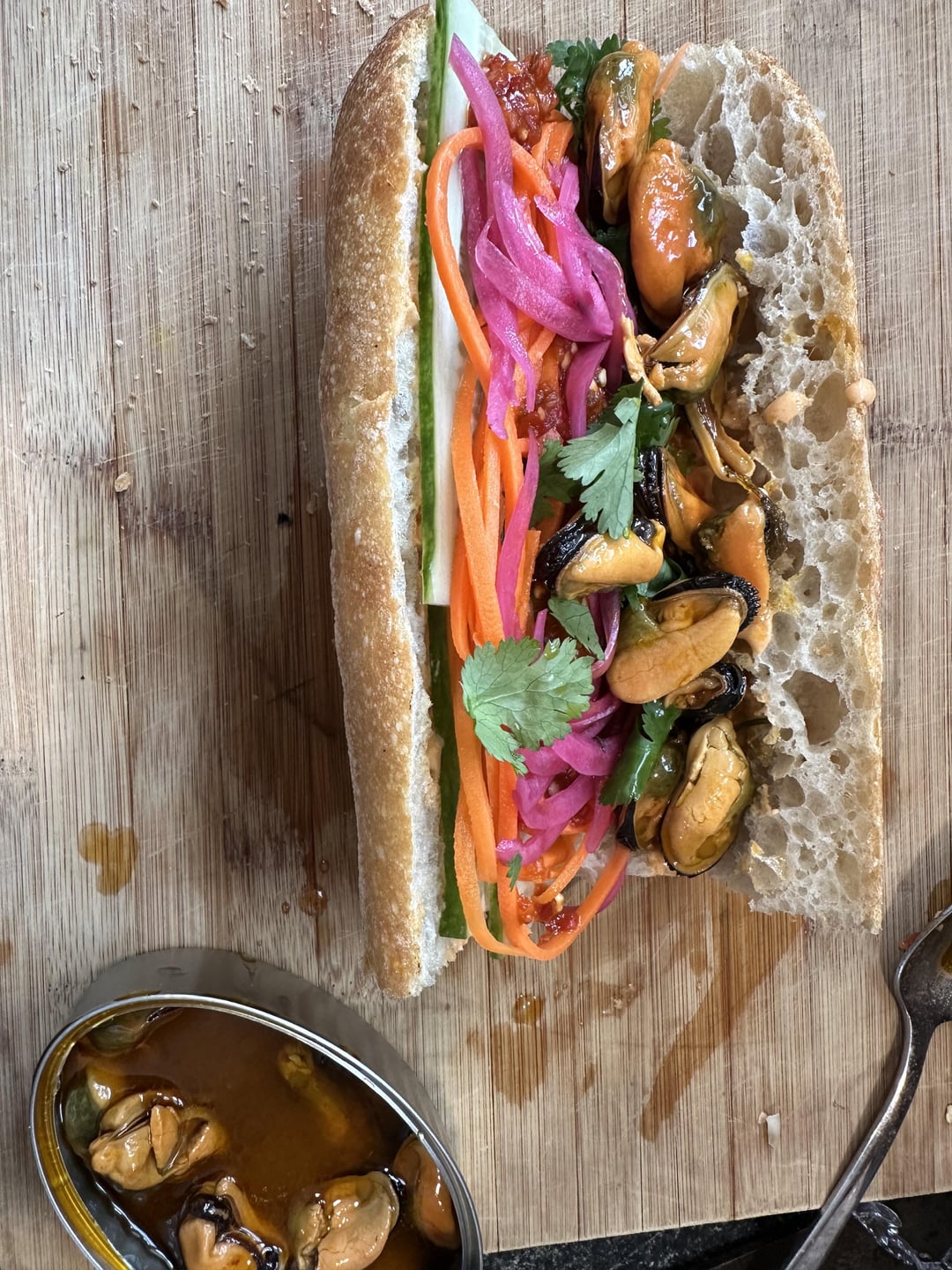 Cucumber, picked carrot strands, pickled red onion, cilantro, Sriracha kewpie mayo, Hoy Fong chili garlic sauce, and Matiz Mussels in pickled sauce.