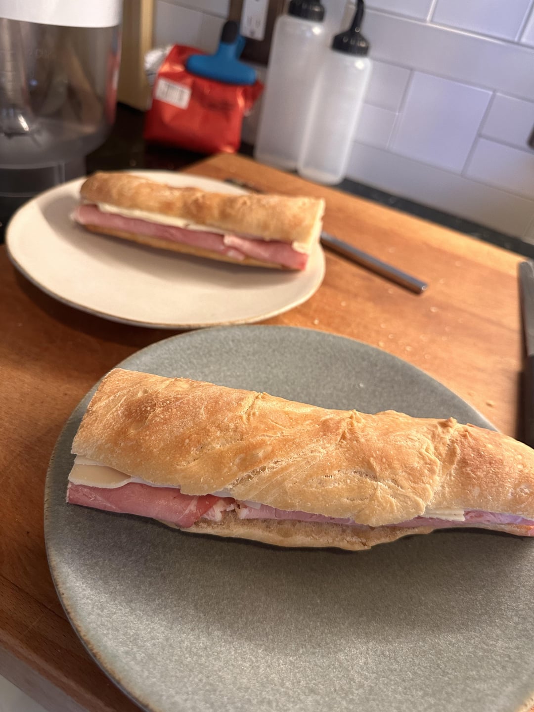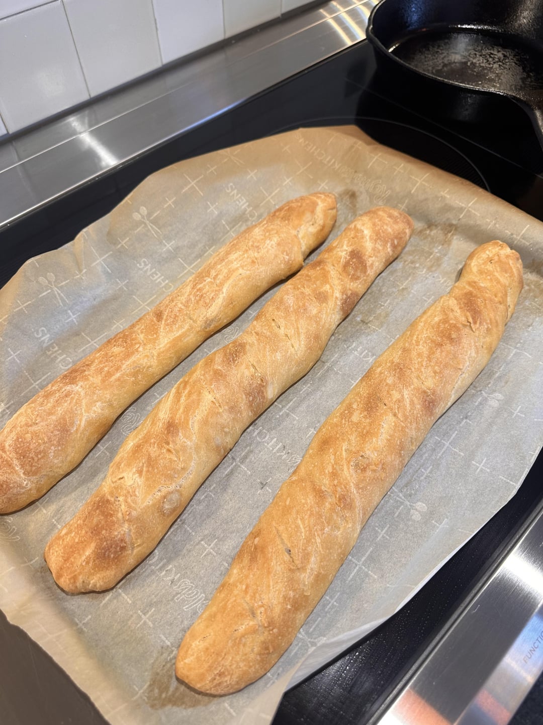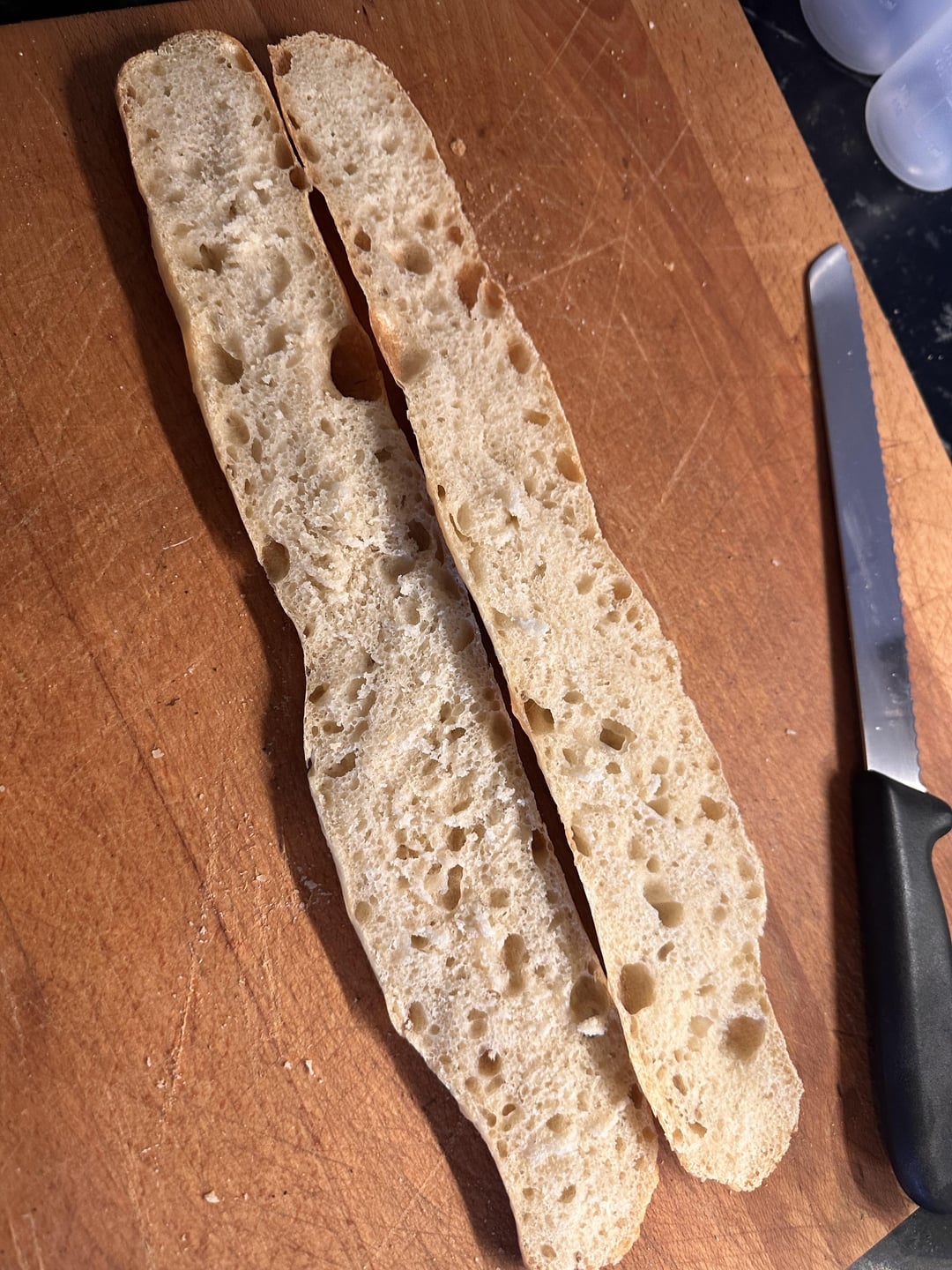 It’s tough to see in the photos, but I think I can make out a handful of scores that are almost perpendicular to the length of the baguettes. It can be difficult to do properly without a sharp lame, but it’s preferable to score almost 90 degrees in the other orientation; that is, to score nearly parallel with the length of the bread with overlapping cuts. This gives the expanding dough a much bigger “escape route” as it were.