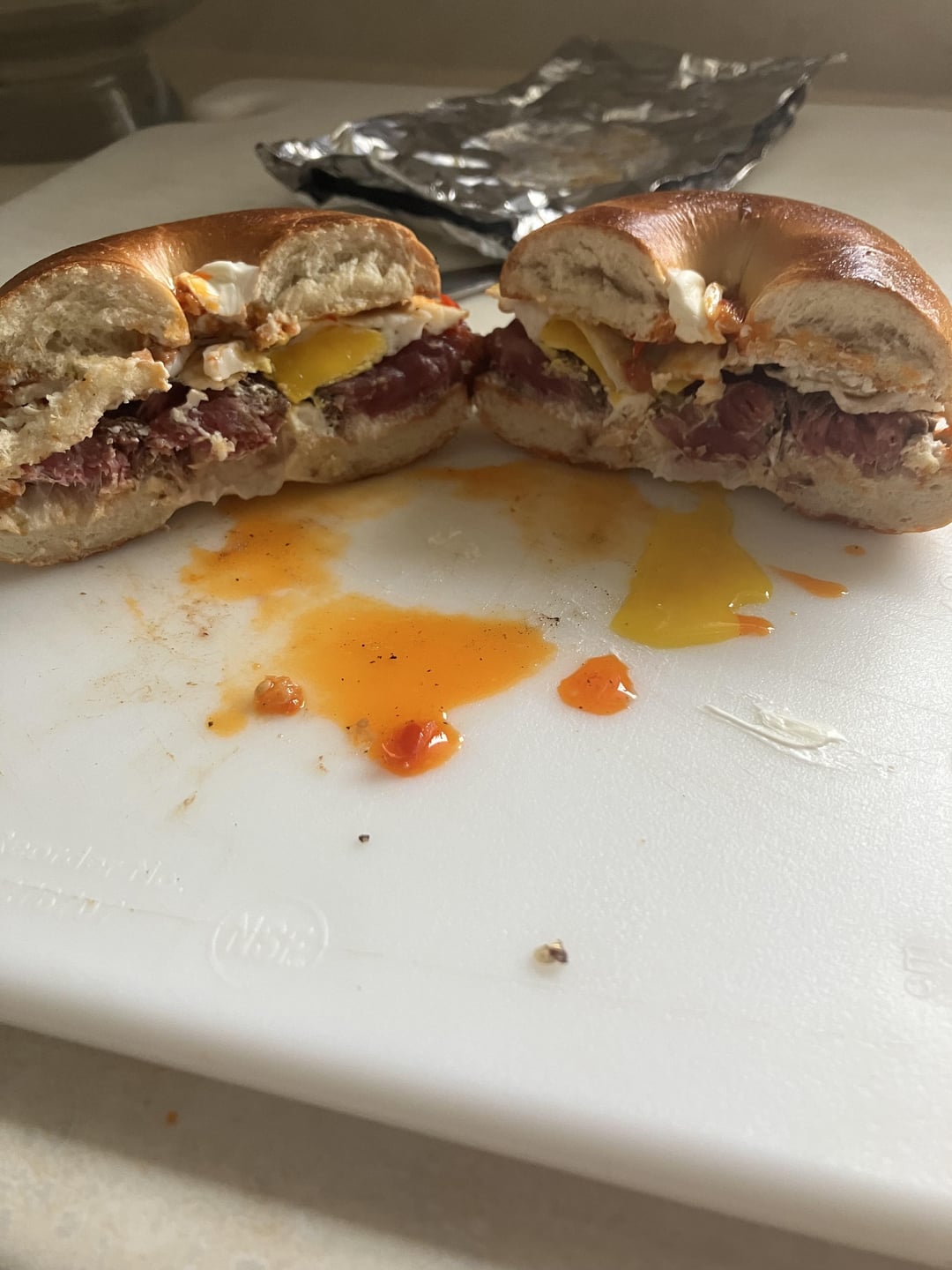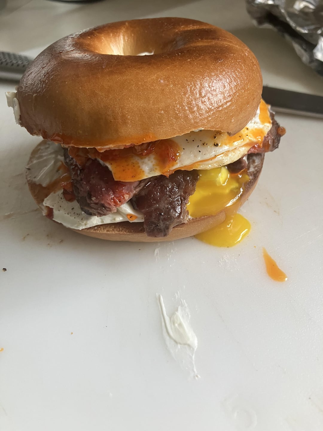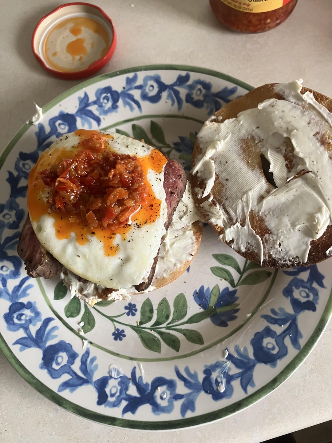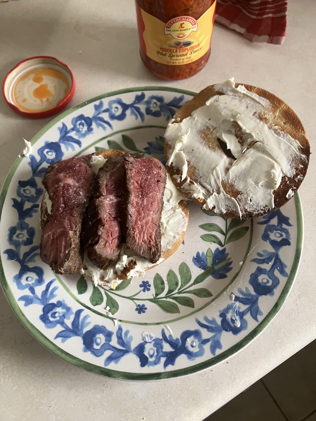 Leftover ribeye, cream cheese, egg, and pepper relish on toasted bagel