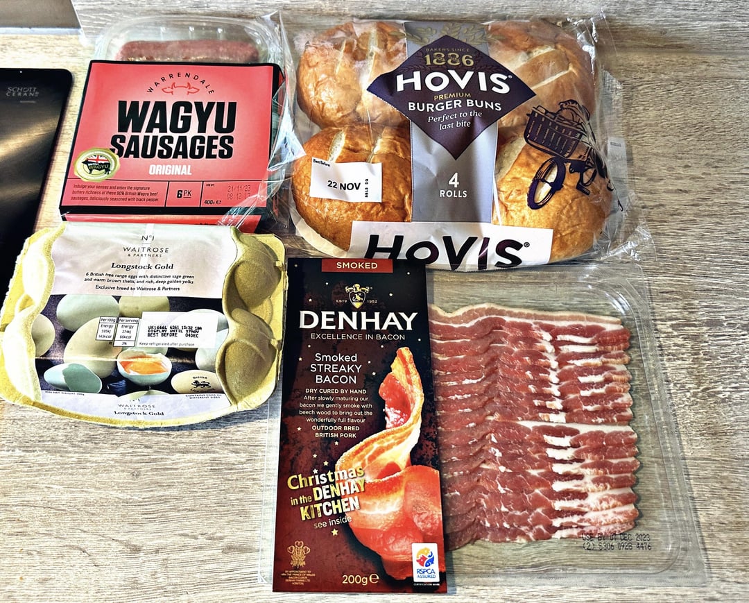 Wagyu sausages. Crispy smoked bacon. Longstock gold fried eggs with a bit of brown sauce. A classic UK breakfast sammich!