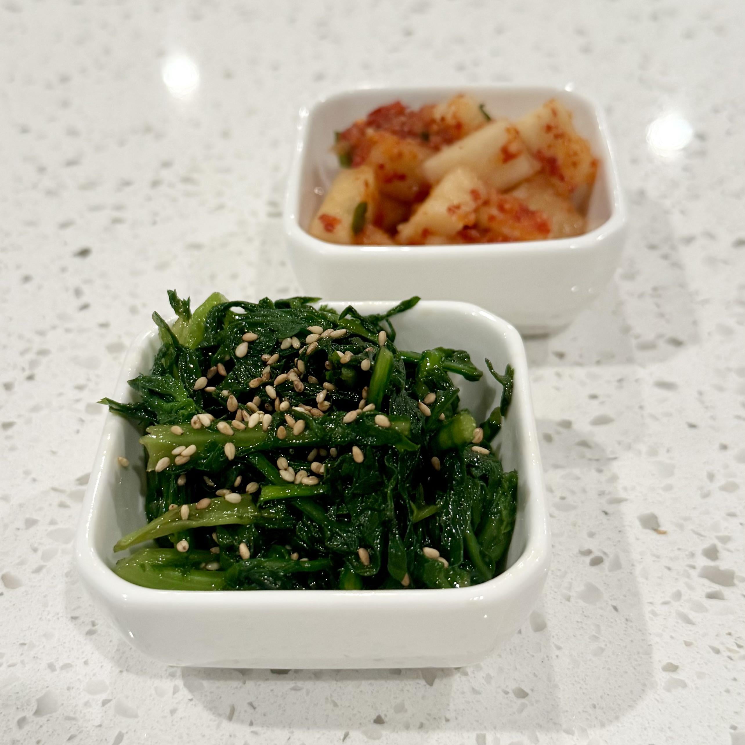 Thanks everyone for the suggestions for my chrysanthemum leaves! I made a simple side by blanching them, rinsing in cold water, and adding a little sesame oil & soup soy sauce. (Homemade kkakdugi in the background)