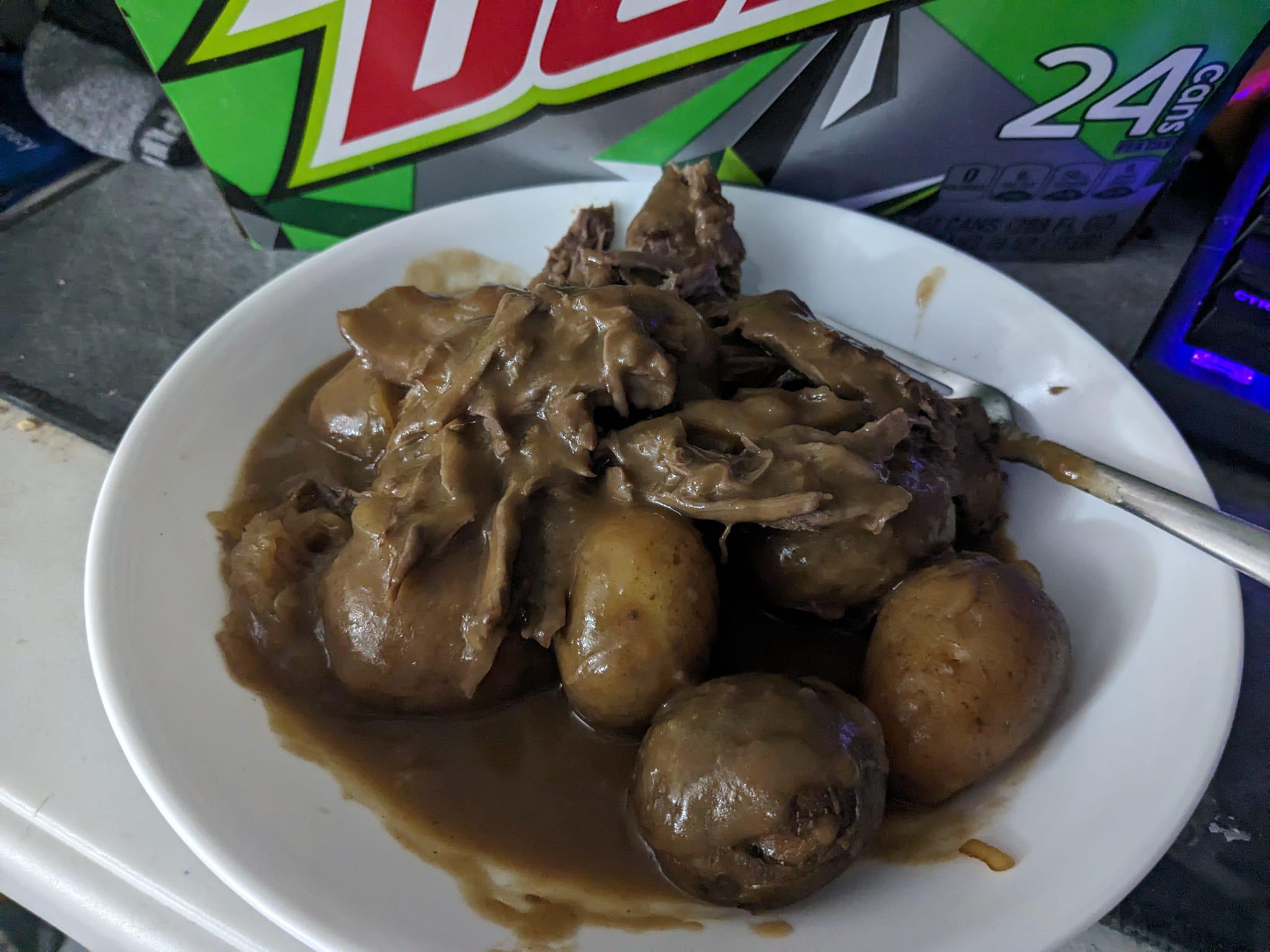Everything in the crockpot for 4 hours high or 8 hours low. Searing didn’t seem to make a difference, so save yourself from cleaning the extra pan. Onions on bottom, half the soup mix, roast, the other half of the soup mix, potatoes around the roast on the sides, 1 1/2 cups of beef broth poured on the top.