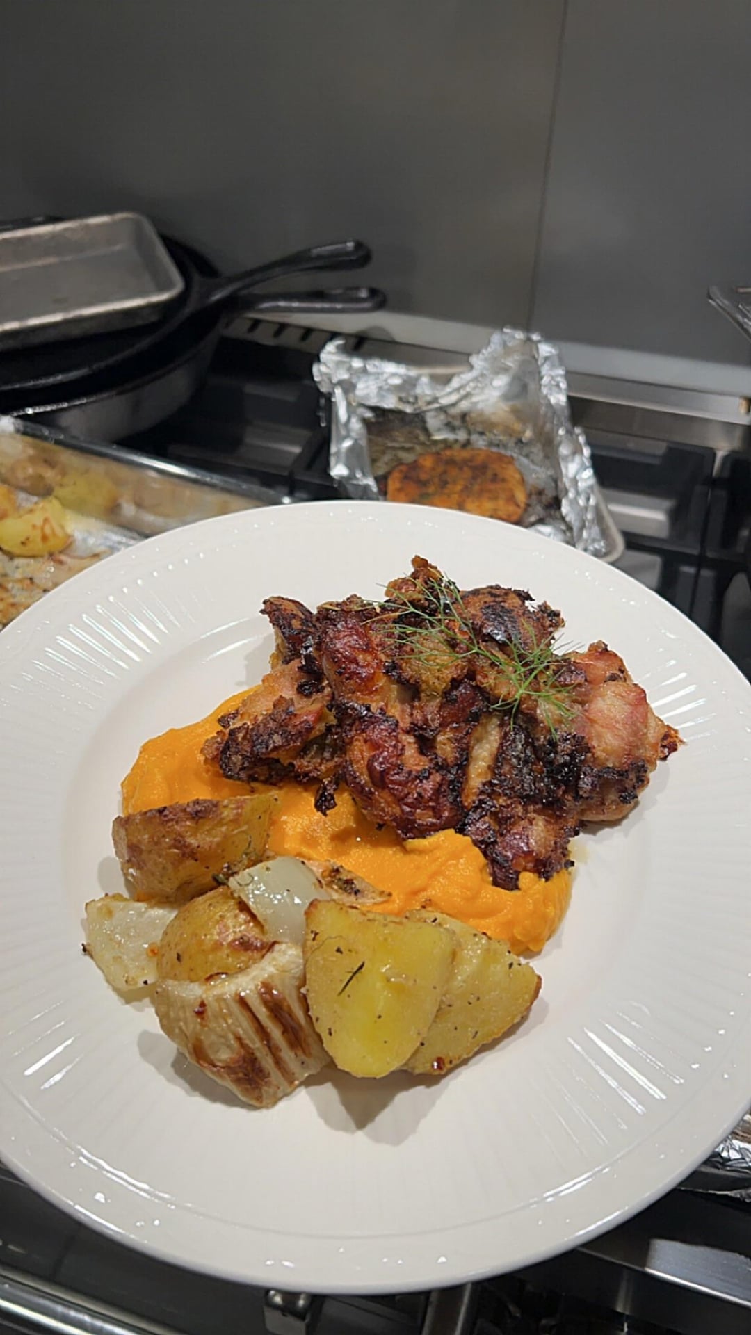 Plating composition could be a lot better. You’ve got a semi burnt skinless thigh, a pile of veg, and a bright colored puree. Green stuff would play well with your colors. Think herbs, green veg, an infused oil. Maybe you run small little groups intended to be eaten as one or two bites, you carve the chicken and serve it on top or next to a small pile of your roasted veg. It’s definitely not an easy task making pedestrian food look like it’s worth a 50$ bill, but foundationally it could turn into something really pretty with a fair amount of work.