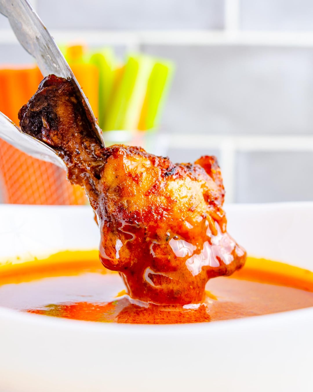 4. **Sauce the wings.** Add half of the homemade buffalo sauce to a large mixing bowl. Place the fully cooked chicken wings into the bowl and toss to coat the wings entirely in the sauce.