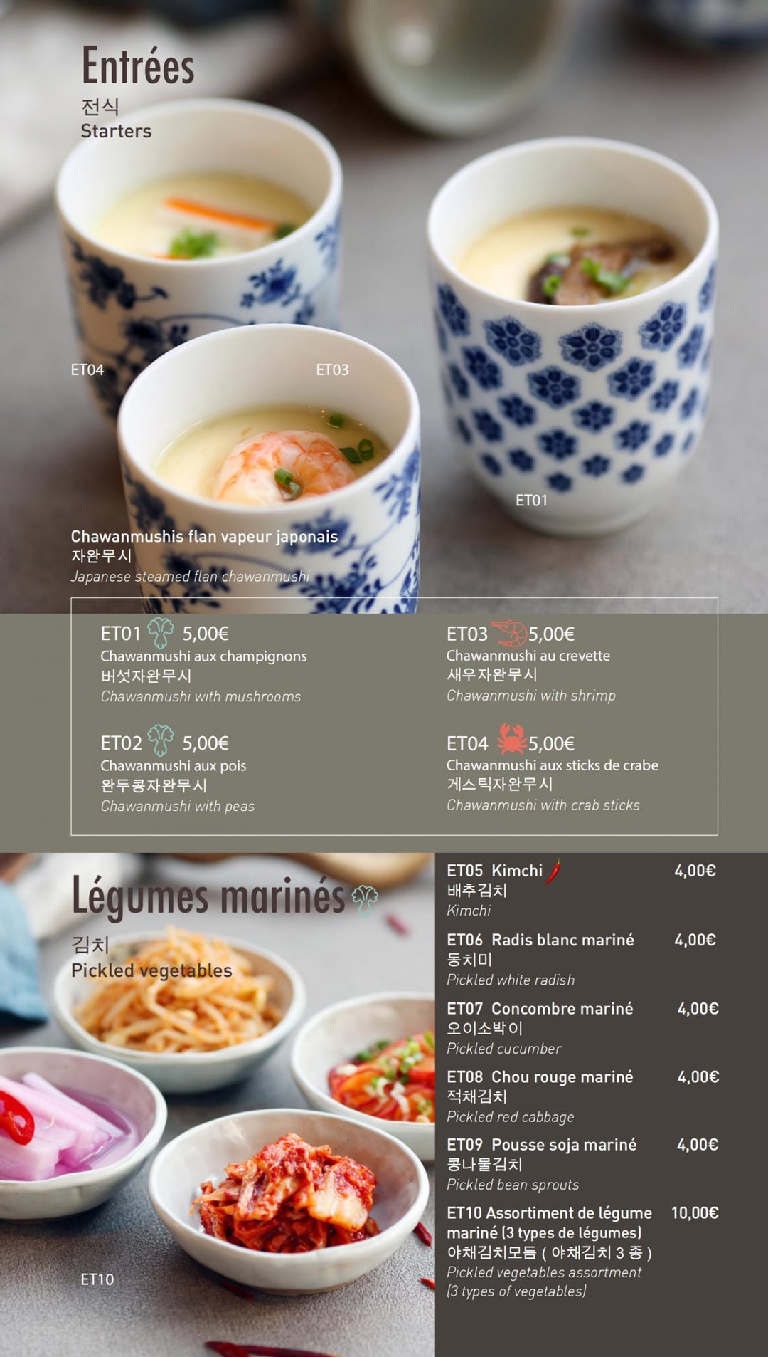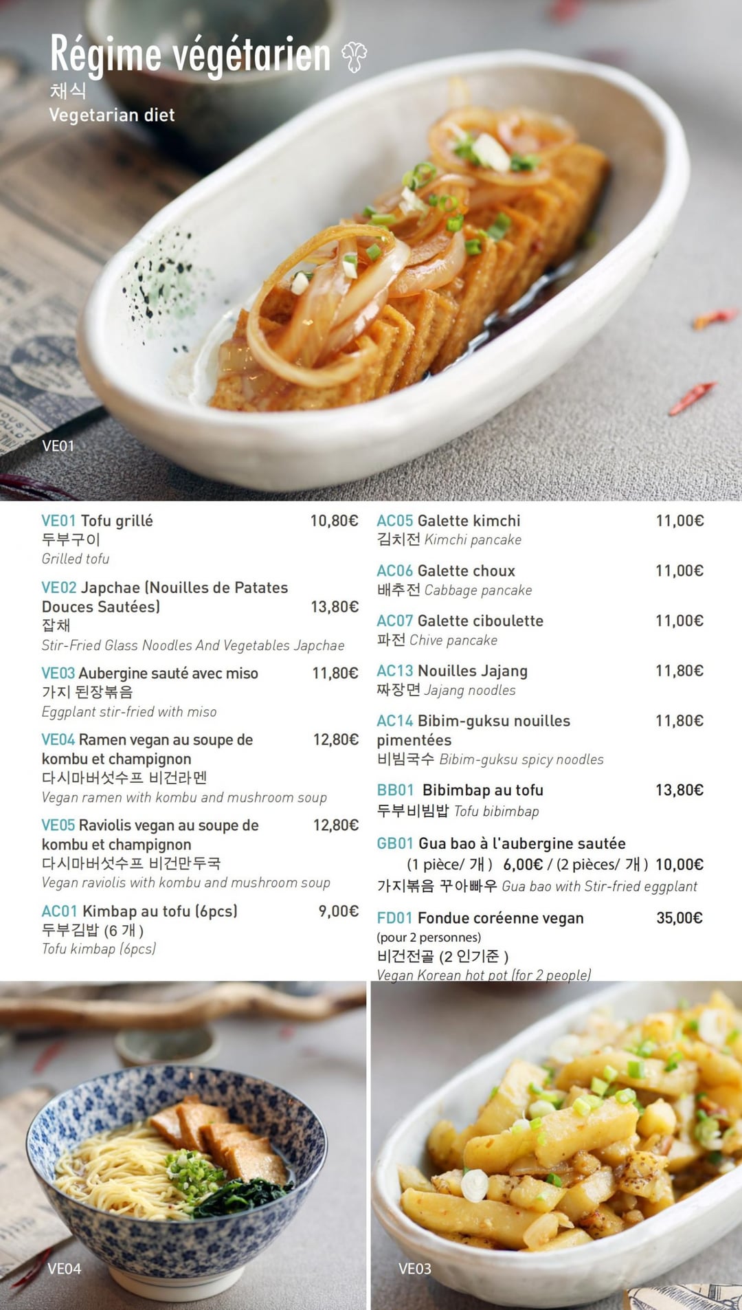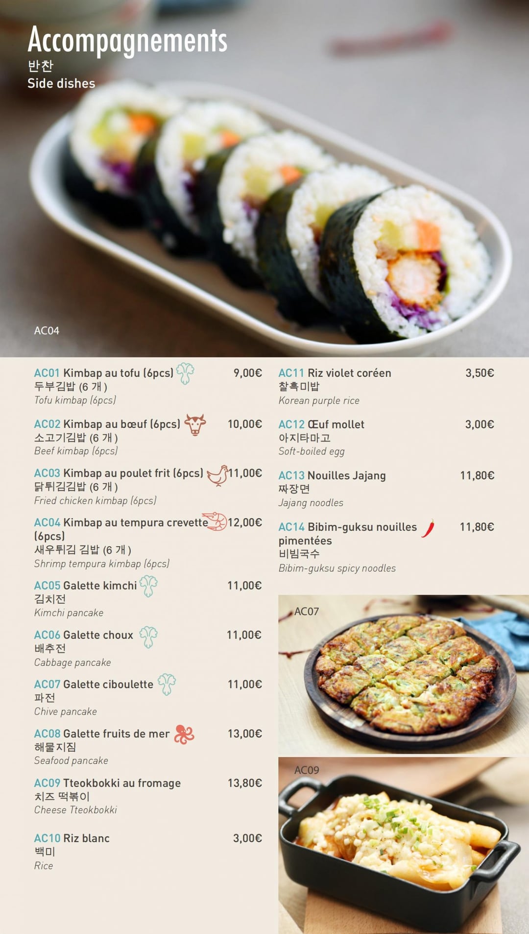 There are plenty of Korean dishes on that menu. Enjoy. J’aime des kimbap, je fais le kimbap au poulet frit avec gochujang tout les temps, c’est exquis.