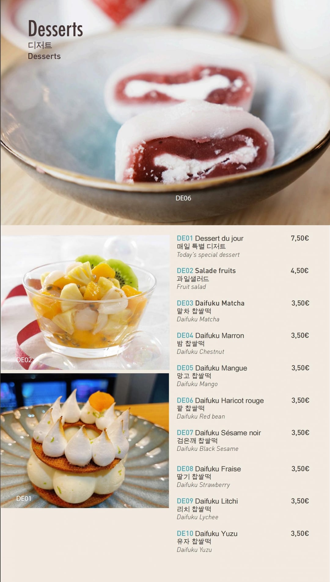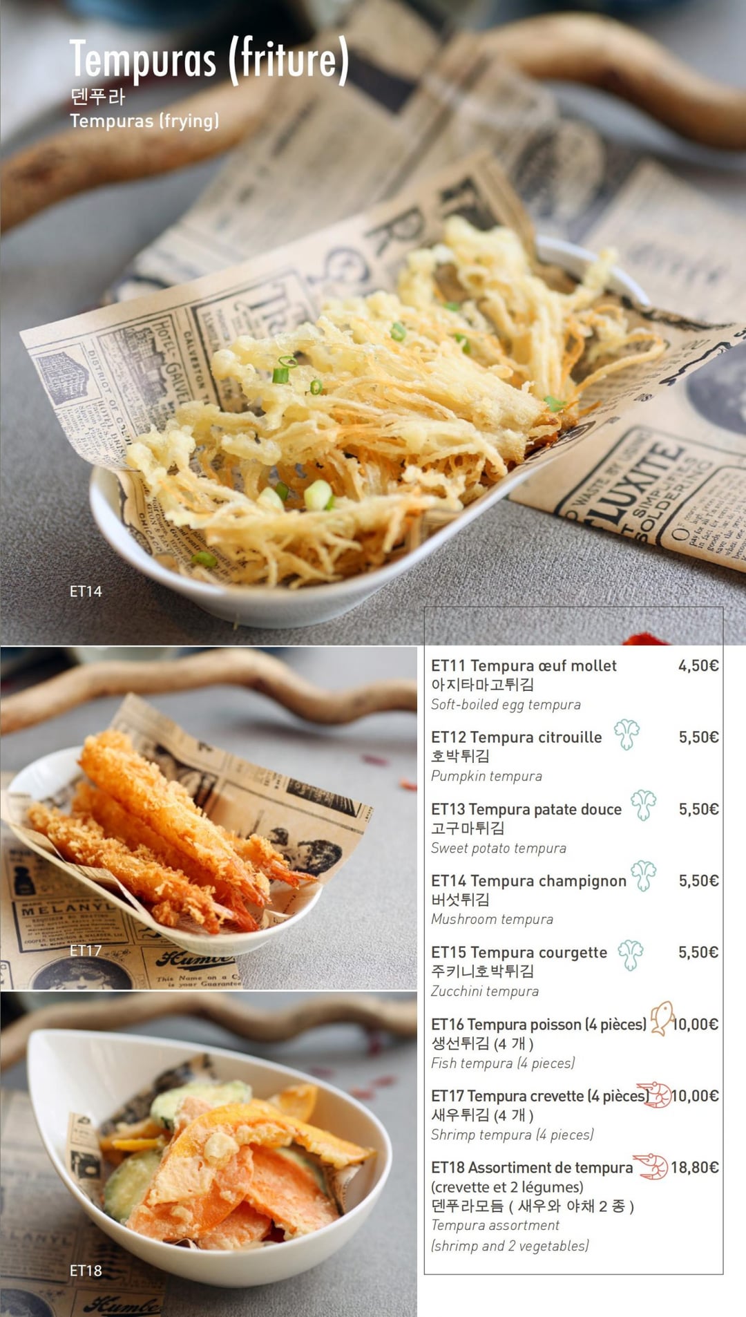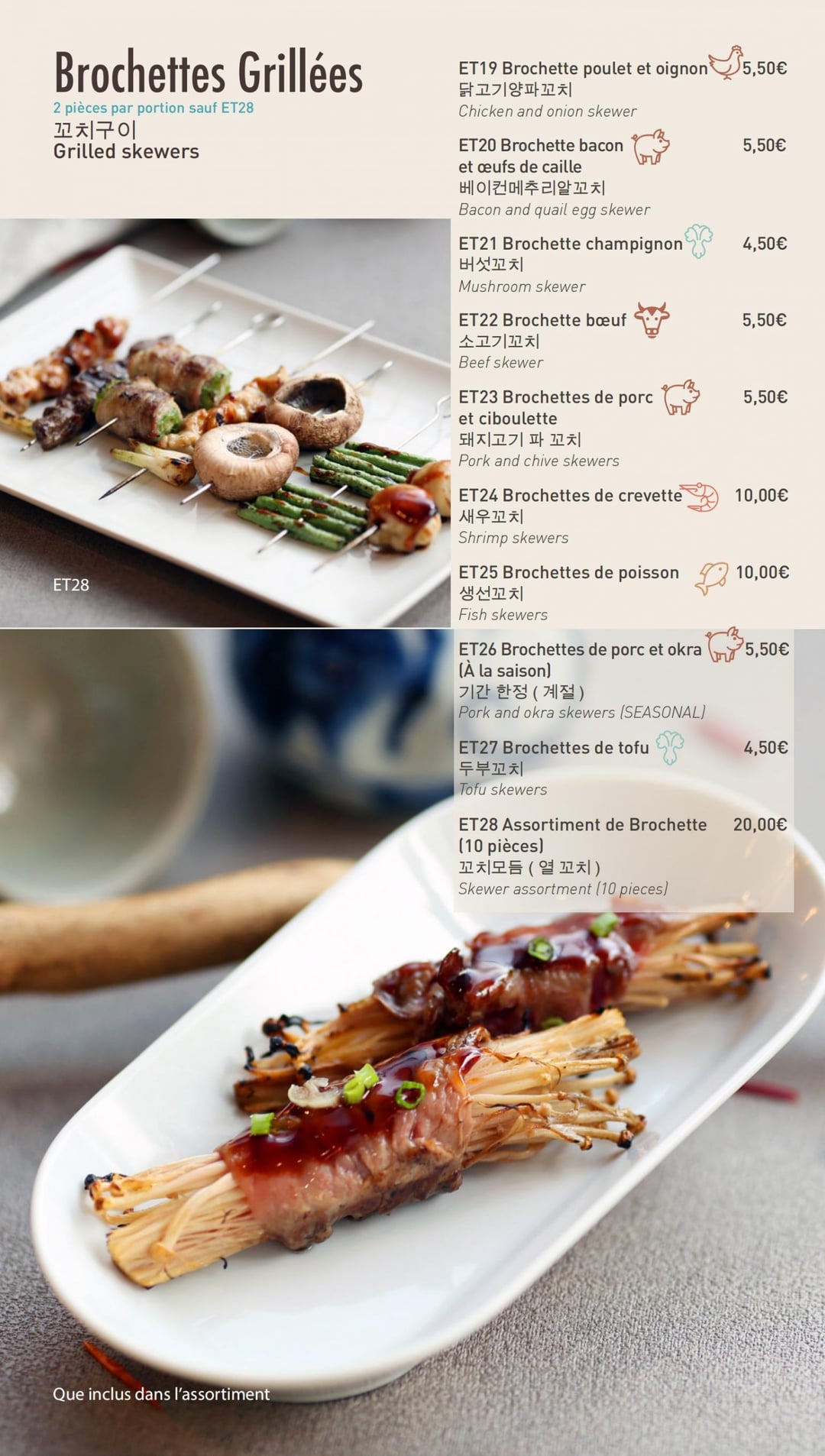 There are plenty of Korean dishes on that menu. Enjoy. J’aime des kimbap, je fais le kimbap au poulet frit avec gochujang tout les temps, c’est exquis.