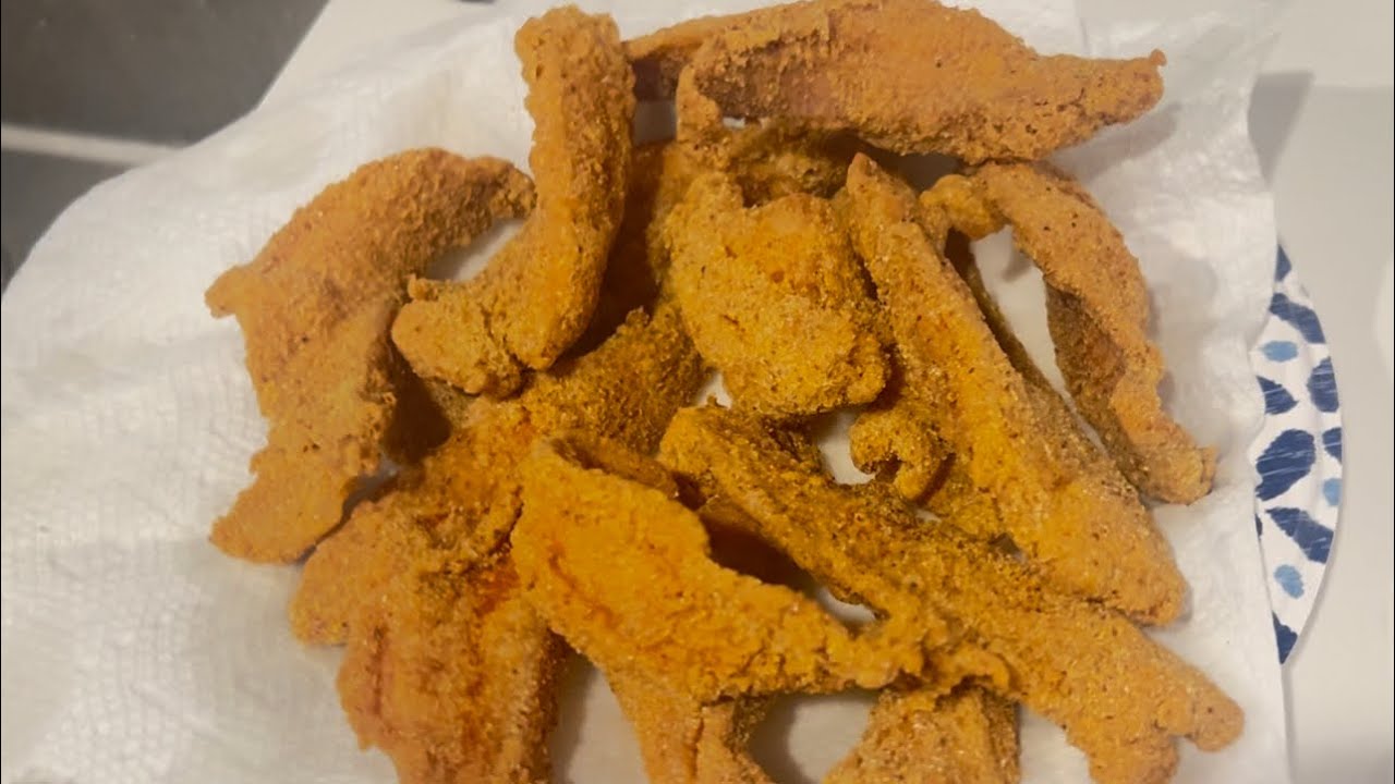 First, get a deep pot suitable for frying the pieces of fish. Add your oil and put it on medium heat, then cut your catfish fillet in half and season it this allows it to fry better. add the preseason cornmeal to a container or a bag of your choice then add your seasoned catfish fillets to the bag and shake it up so that they are fully covered in the cornmeal.  test your oil by splashing some cornmeal in it and if it bubbles quickly, that’s how you know it is ready for the fish. Cook the fish for 10 to 12 minutes. Enjoy!
